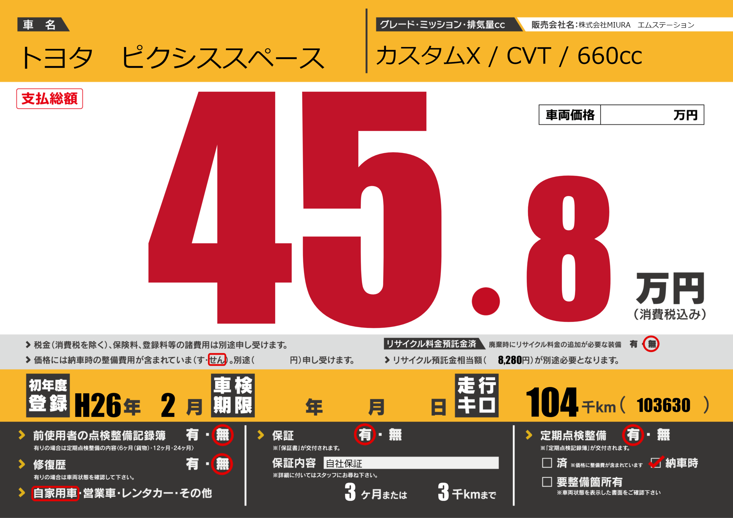 | 車名 | トヨタ ピクシススペース | グレード ミッション 排気量 |