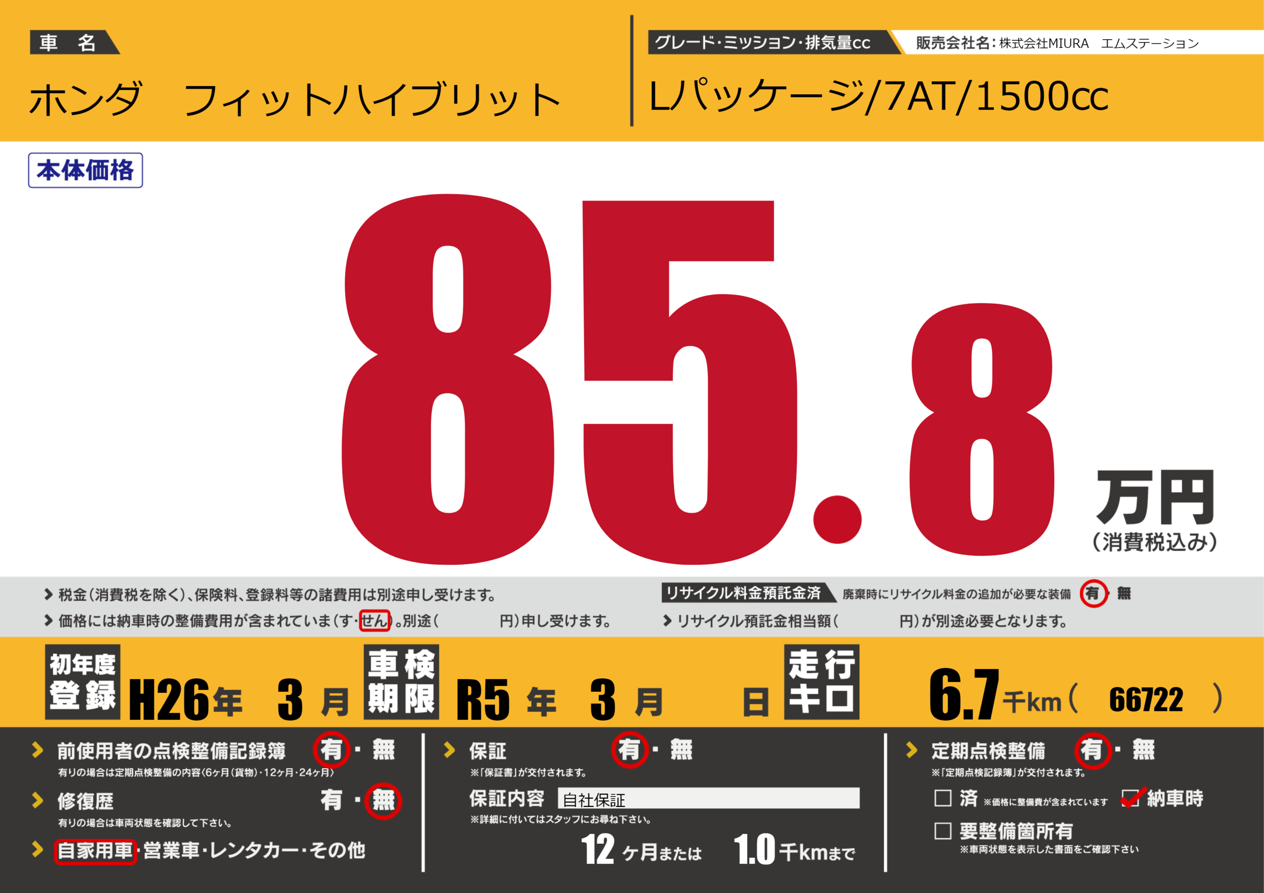 保証付き 保証内容(自社保証) 12ヶ月または1.0千km |