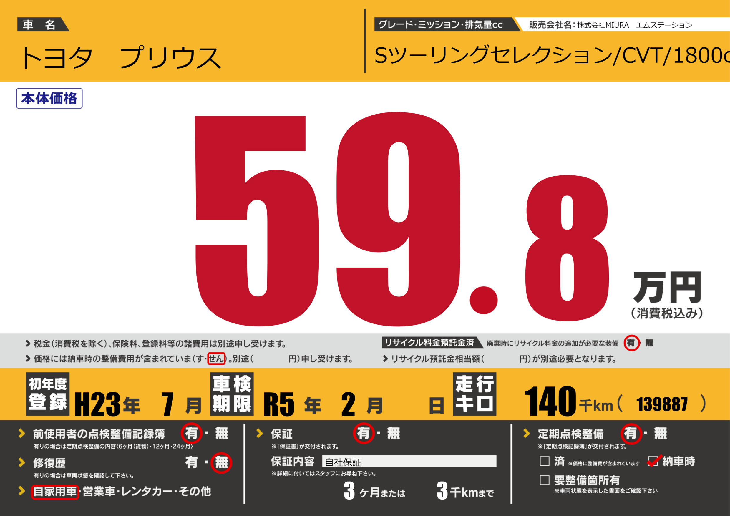なし | 車検制限 | R5年2月---月 |