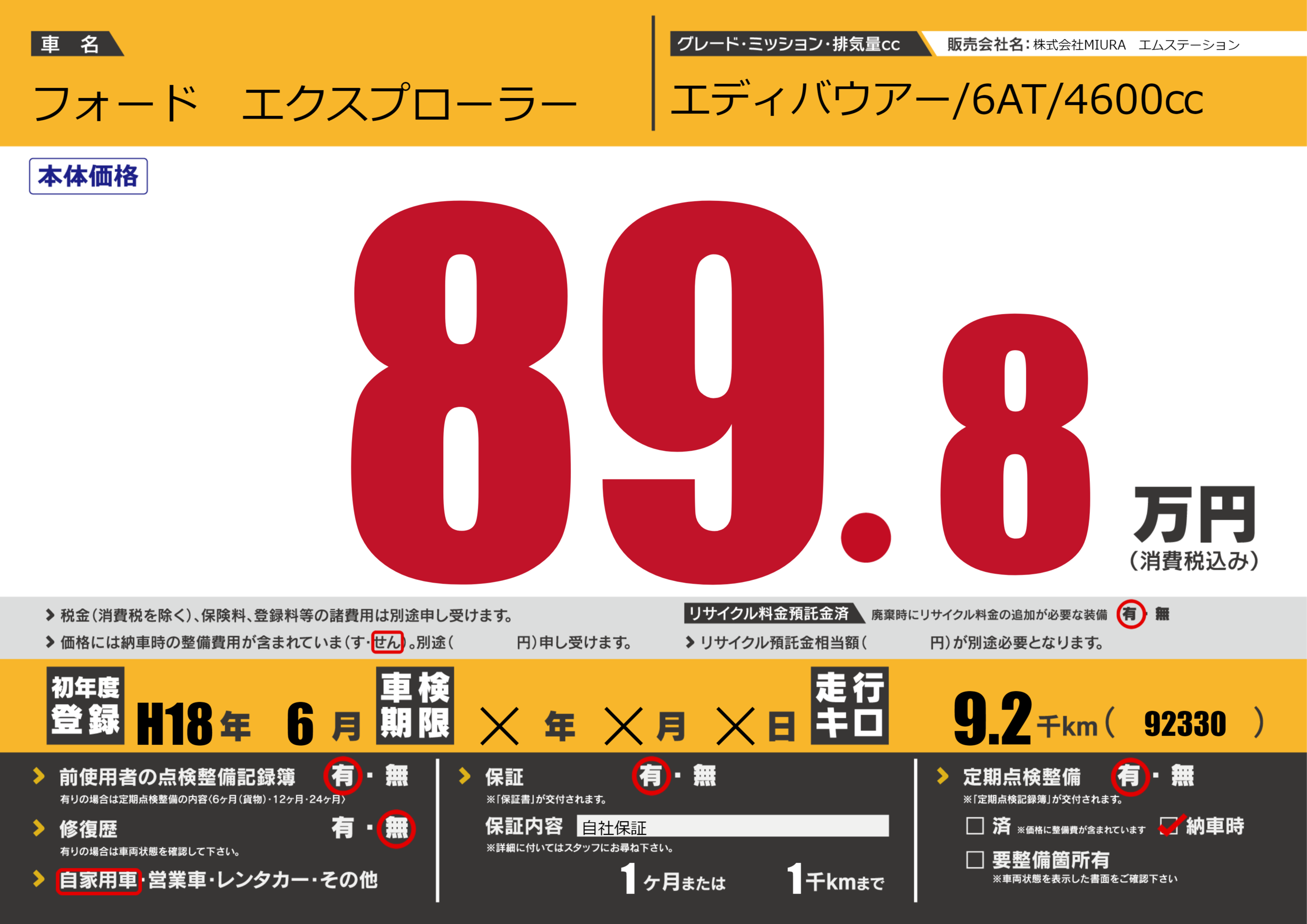 保証付き 保証内容(自社保証) 1ヶ月または(1)千kmまで |