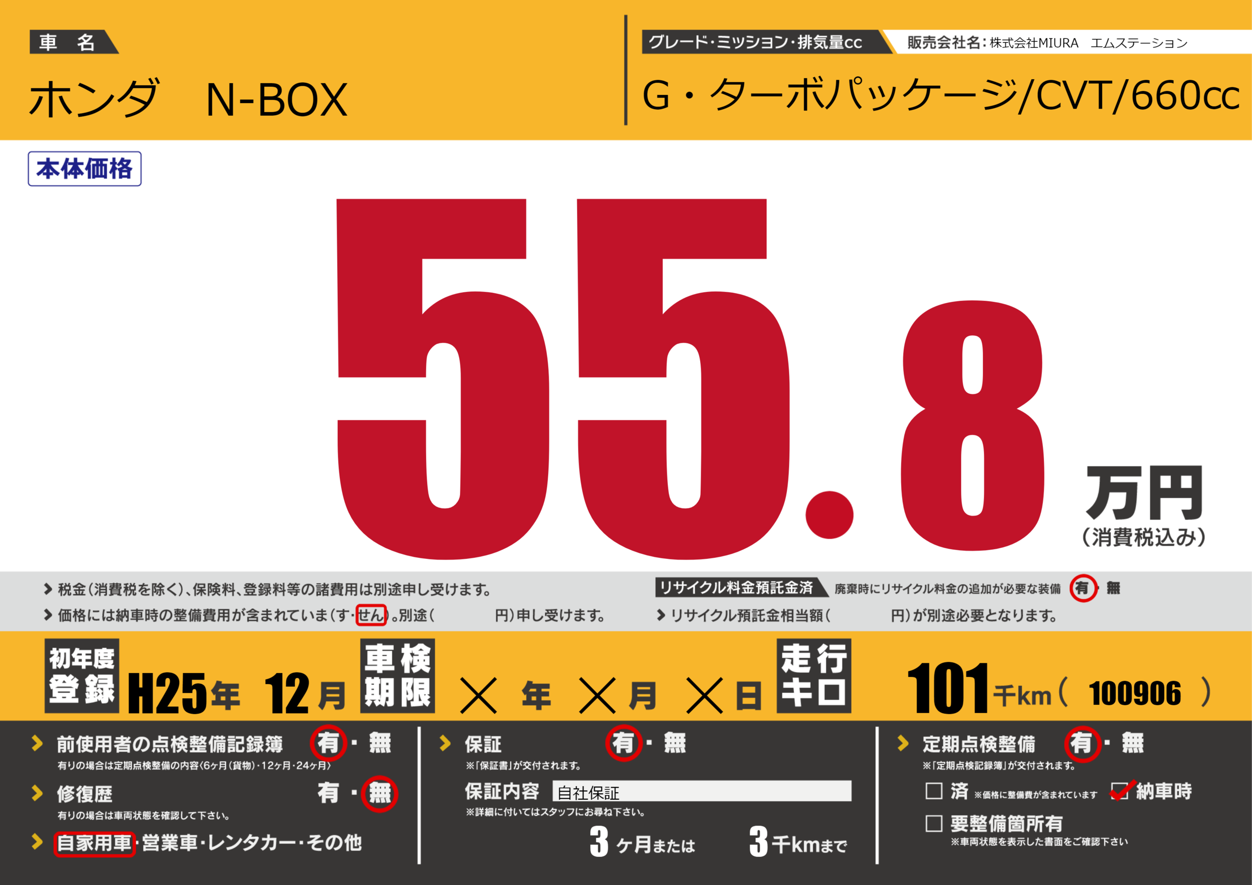 | 車名 | ホンダ N-BOX | グレード ミッション 排気量 |