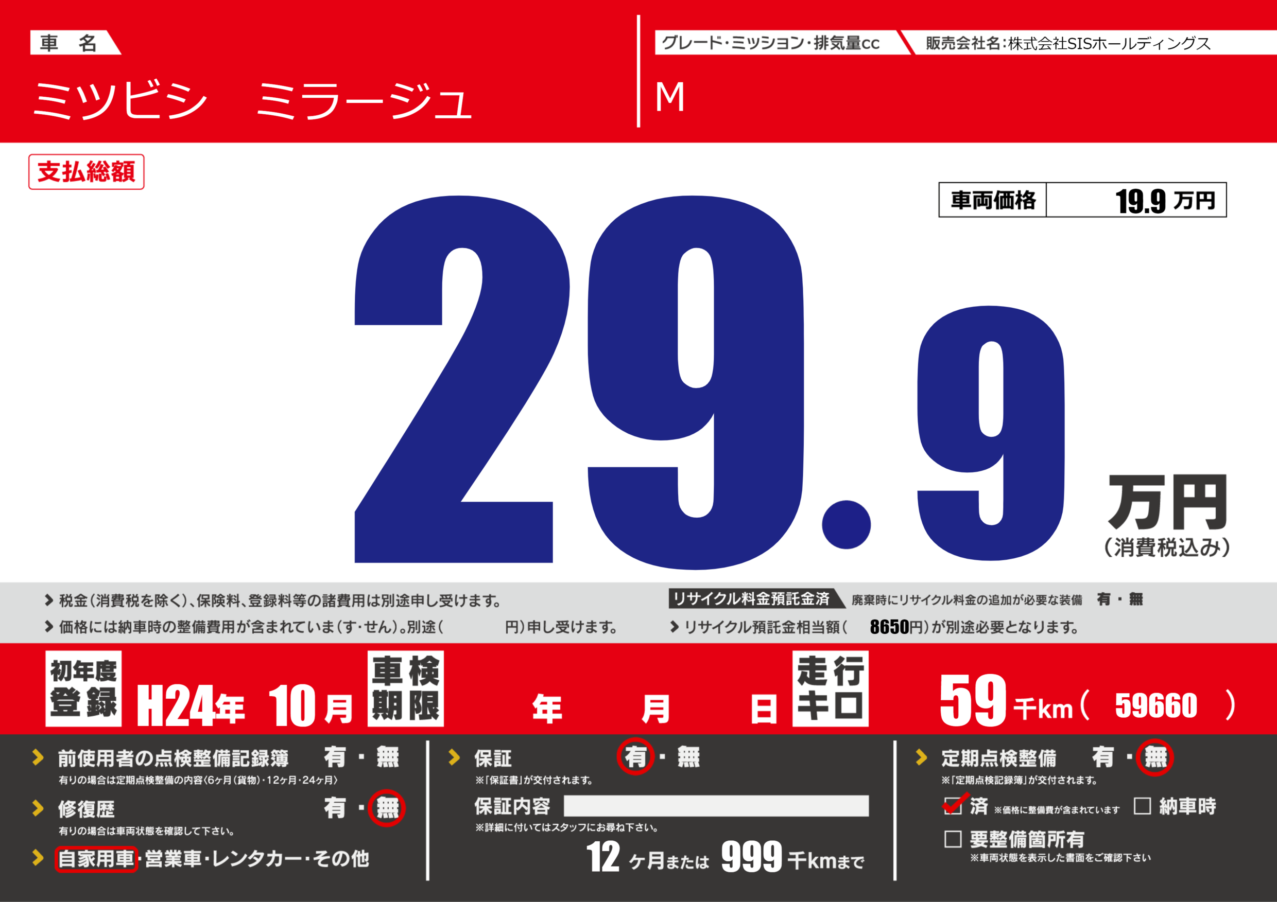 保証付き 保証内容(---) 12ヶ月または(999)千kmまで |