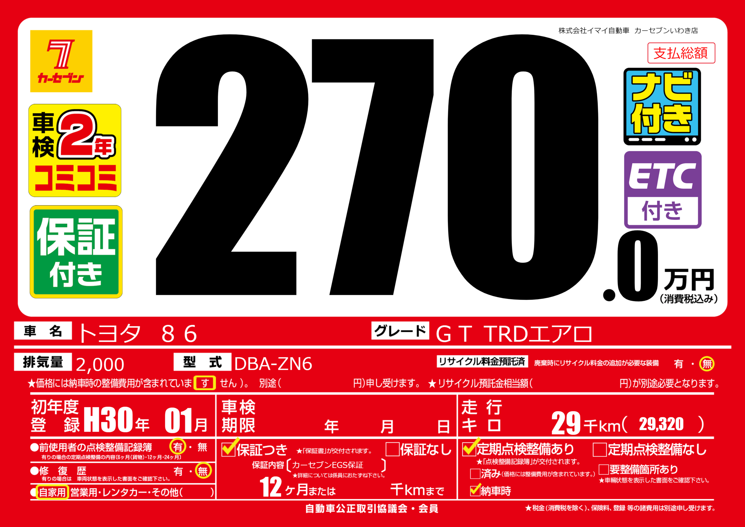 | 車名 | トヨタ 86 | グレード ミッション 排気量 |