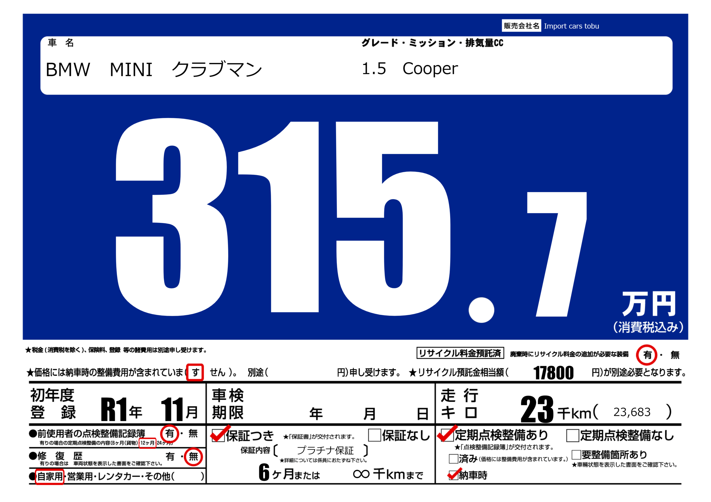保証付き 保証内容( プラチナ保証) 6ヶ月または(∞)千kmまで |