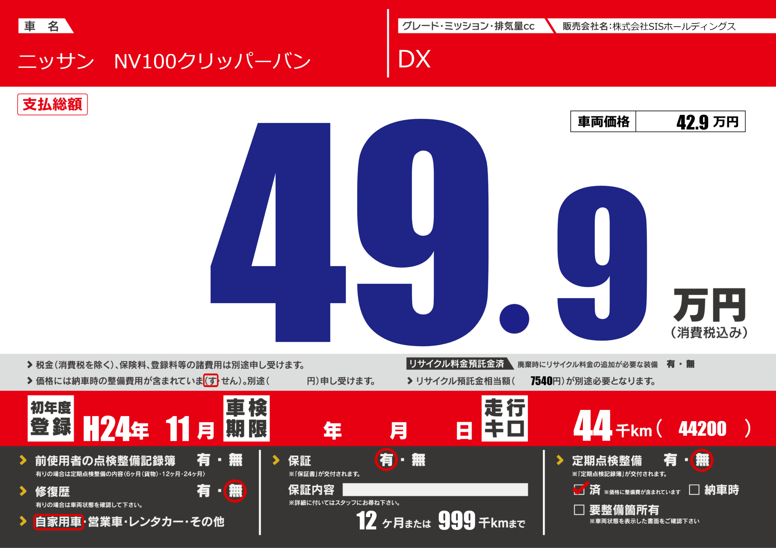 保証付き 保証内容(---) 12ヶ月または(999)千kmまで |