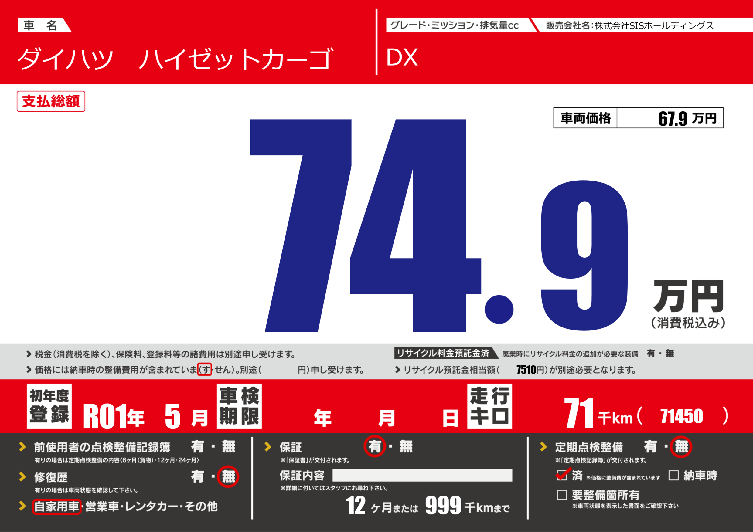 保証付き 保証内容(---) 12ヶ月または(999)千kmまで |