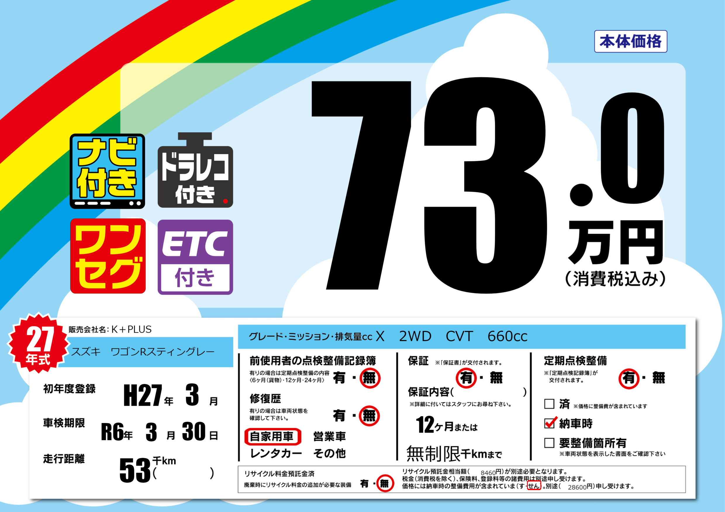 | 走行キロ | 5.3万km | 初年度登録 | H27年3月 |