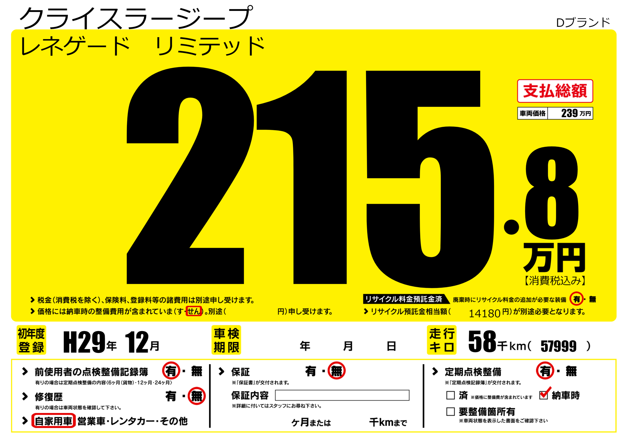 | 走行キロ | 5.8万km | 初年度登録 | H29年12月 |