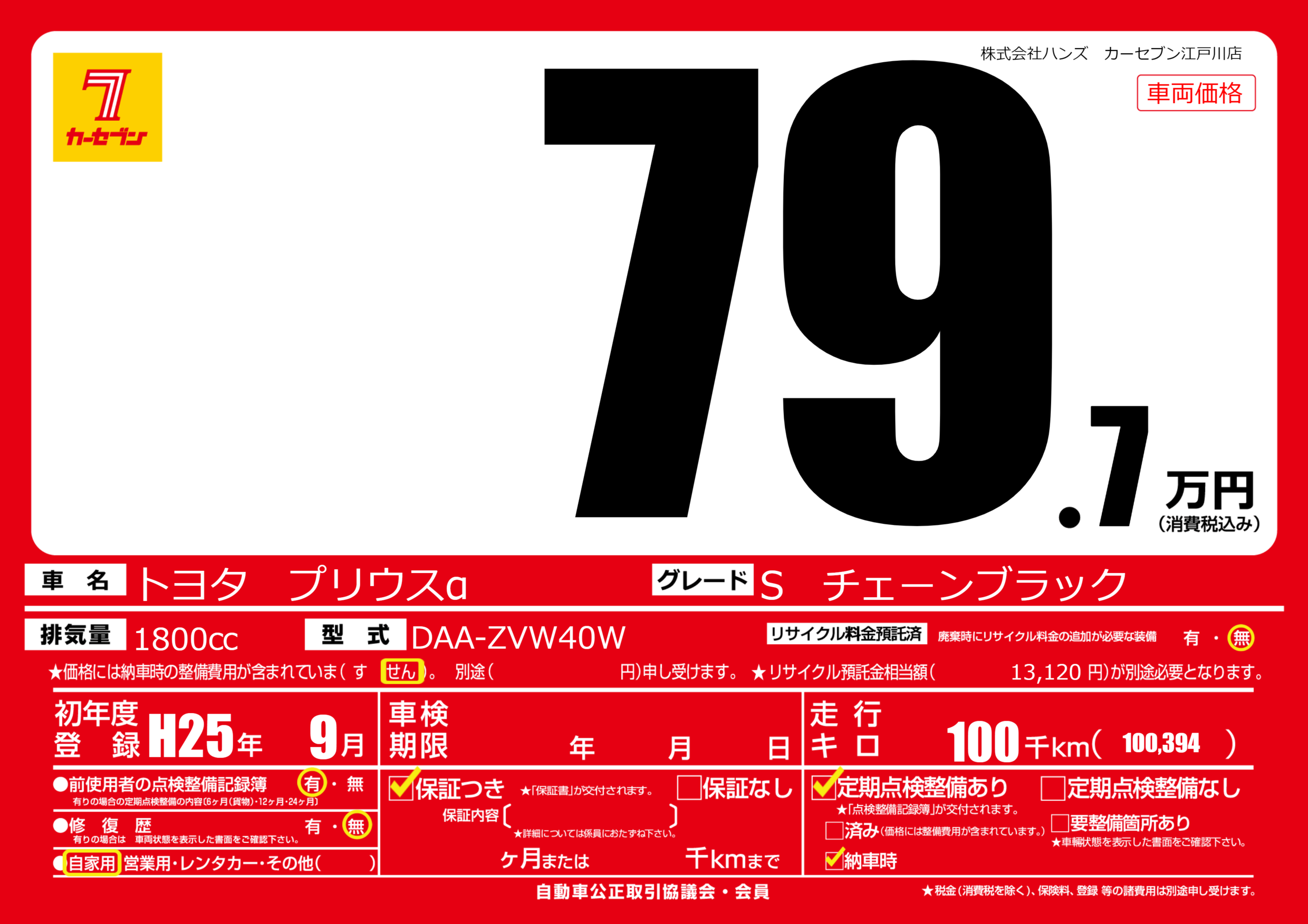 | 車名 | トヨタ プリウスα | グレード ミッション 排気量 |