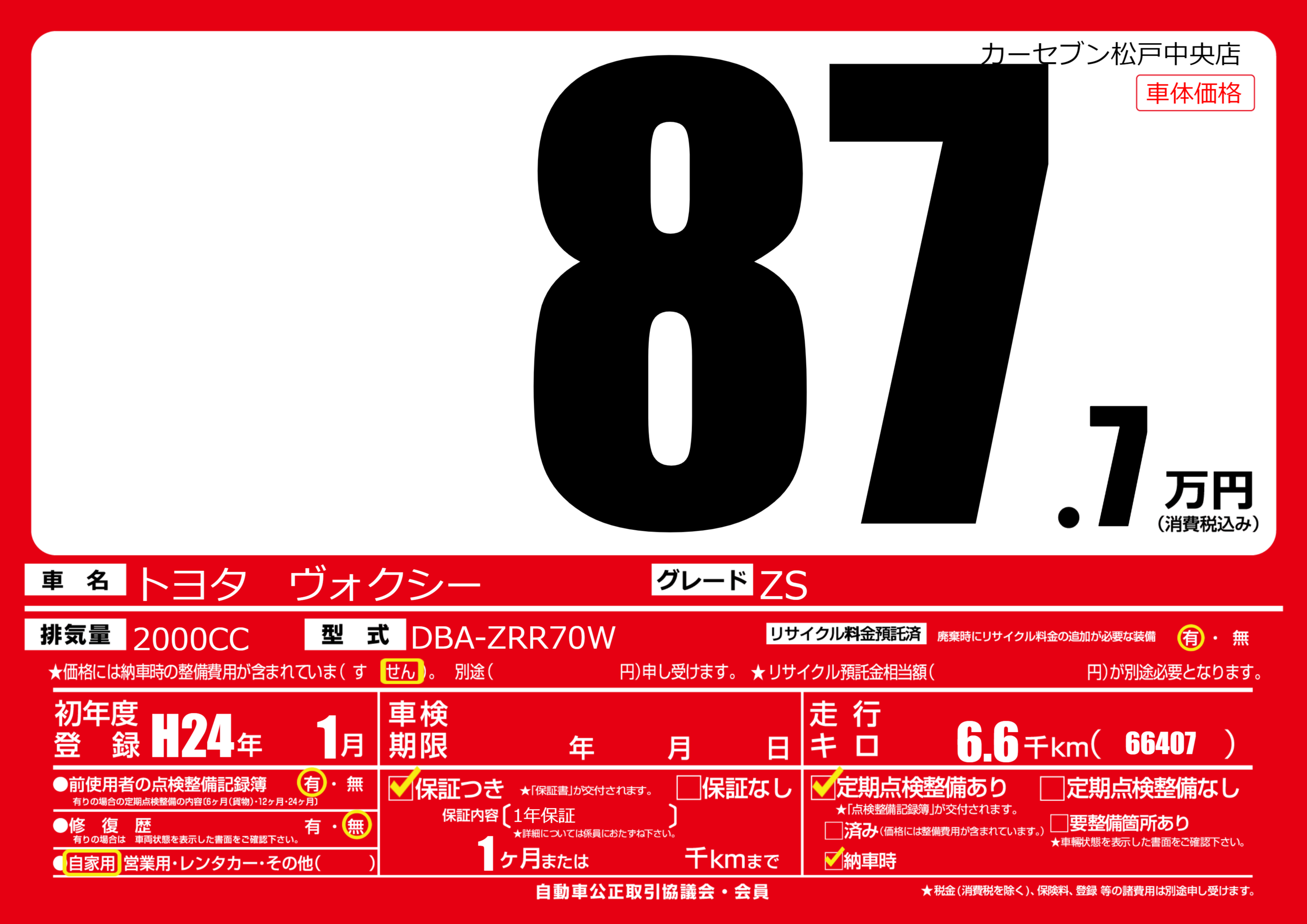 | 車名 | トヨタ ヴォクシー | グレード ミッション 排気量 |