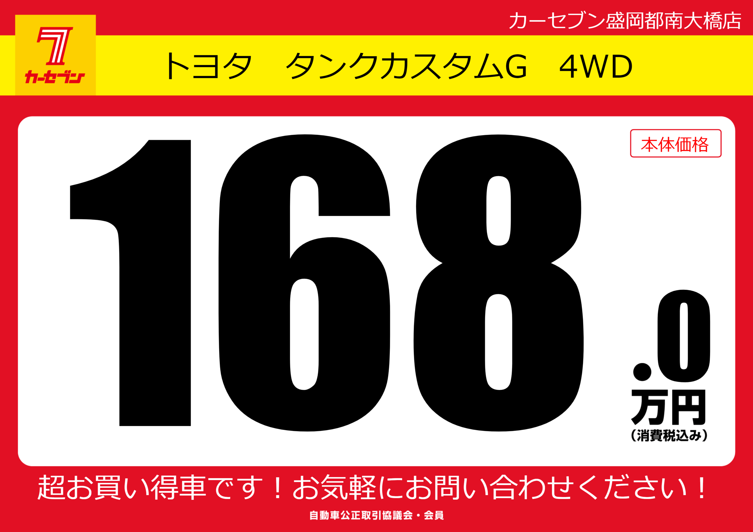 | 車名 | トヨタ タンクカスタムG 4WD | グレード ミッション 排気量 |