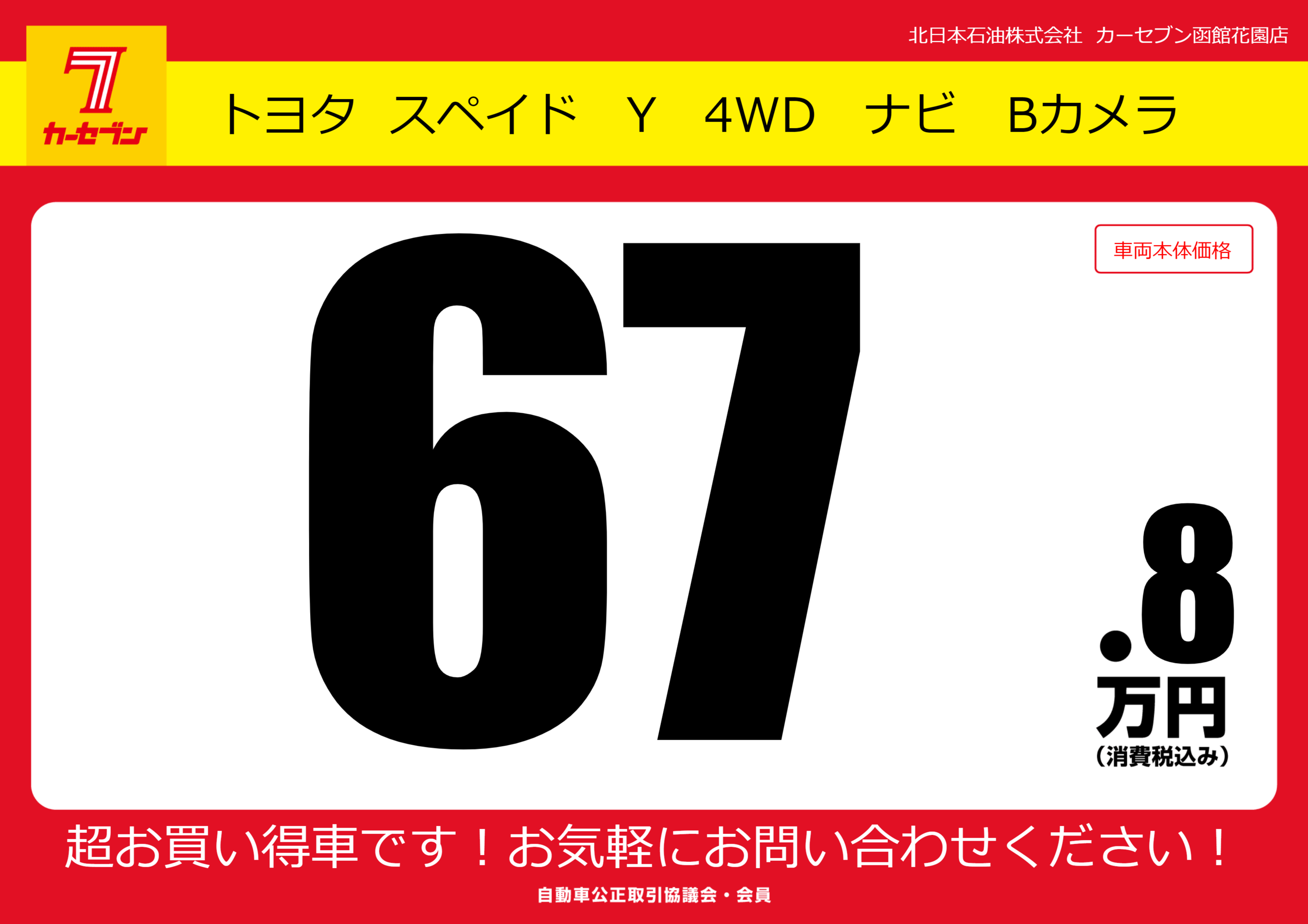 | 車名 | トヨタ スペイド Y 4WD ナビ Bカメラ | グレード ミッション 排気量 |