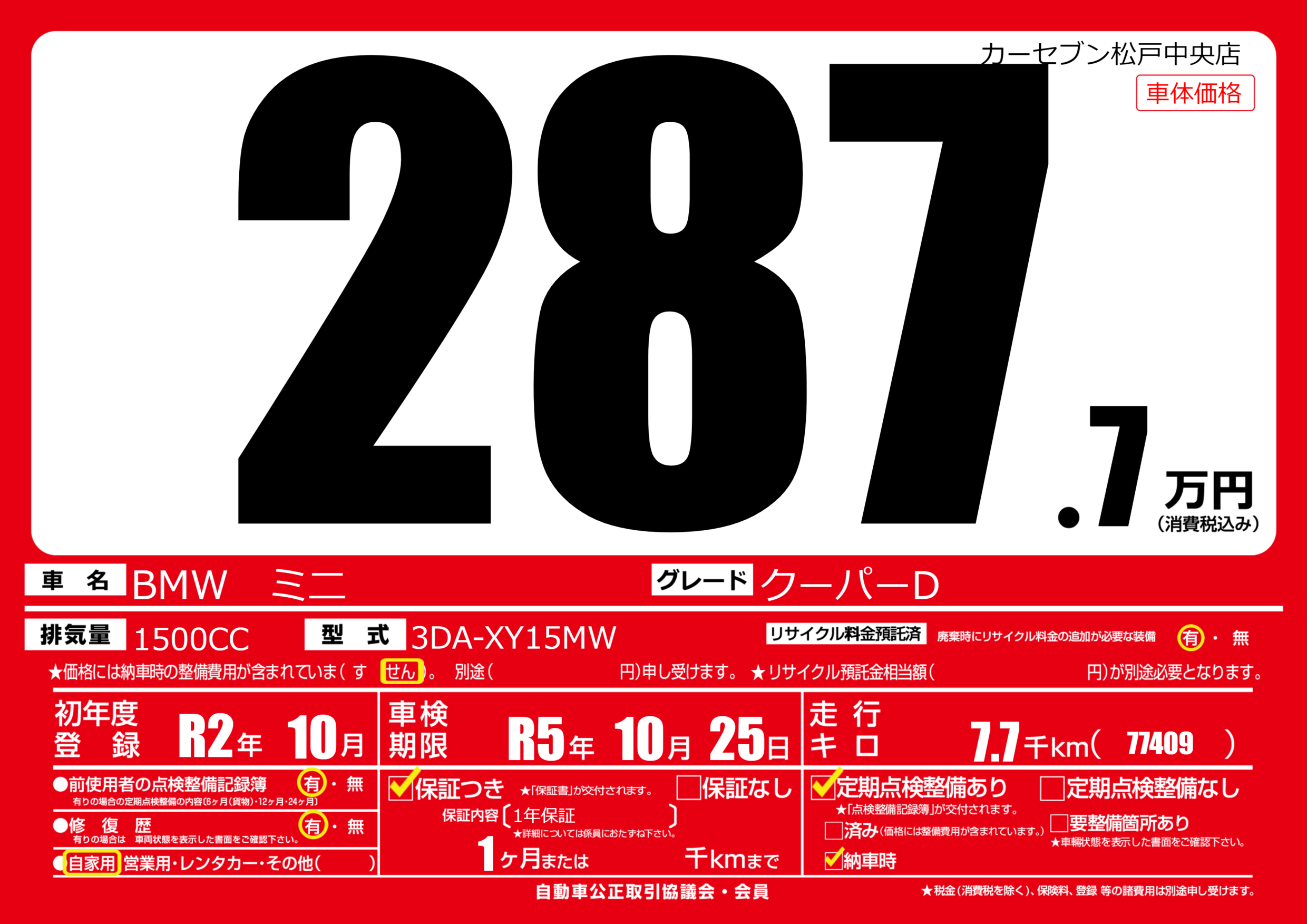 | 車名 | BMW ミニ | グレード ミッション 排気量 |
