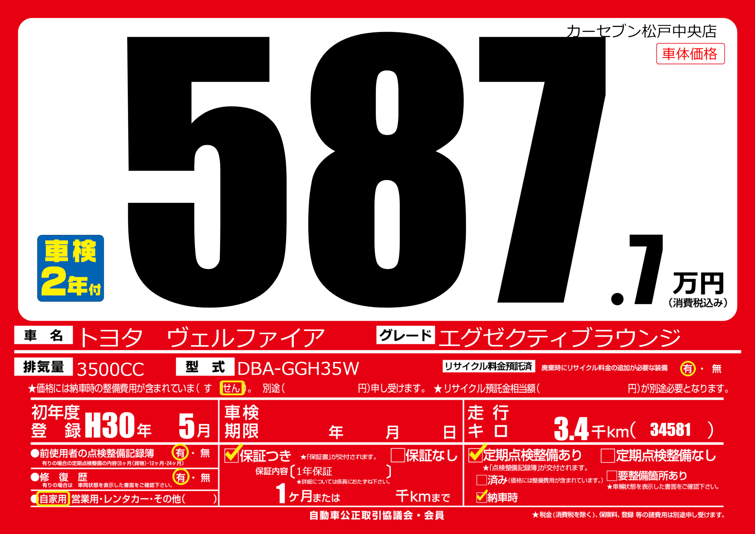 | 車名 | トヨタ ヴェルファイア | グレード ミッション 排気量 |