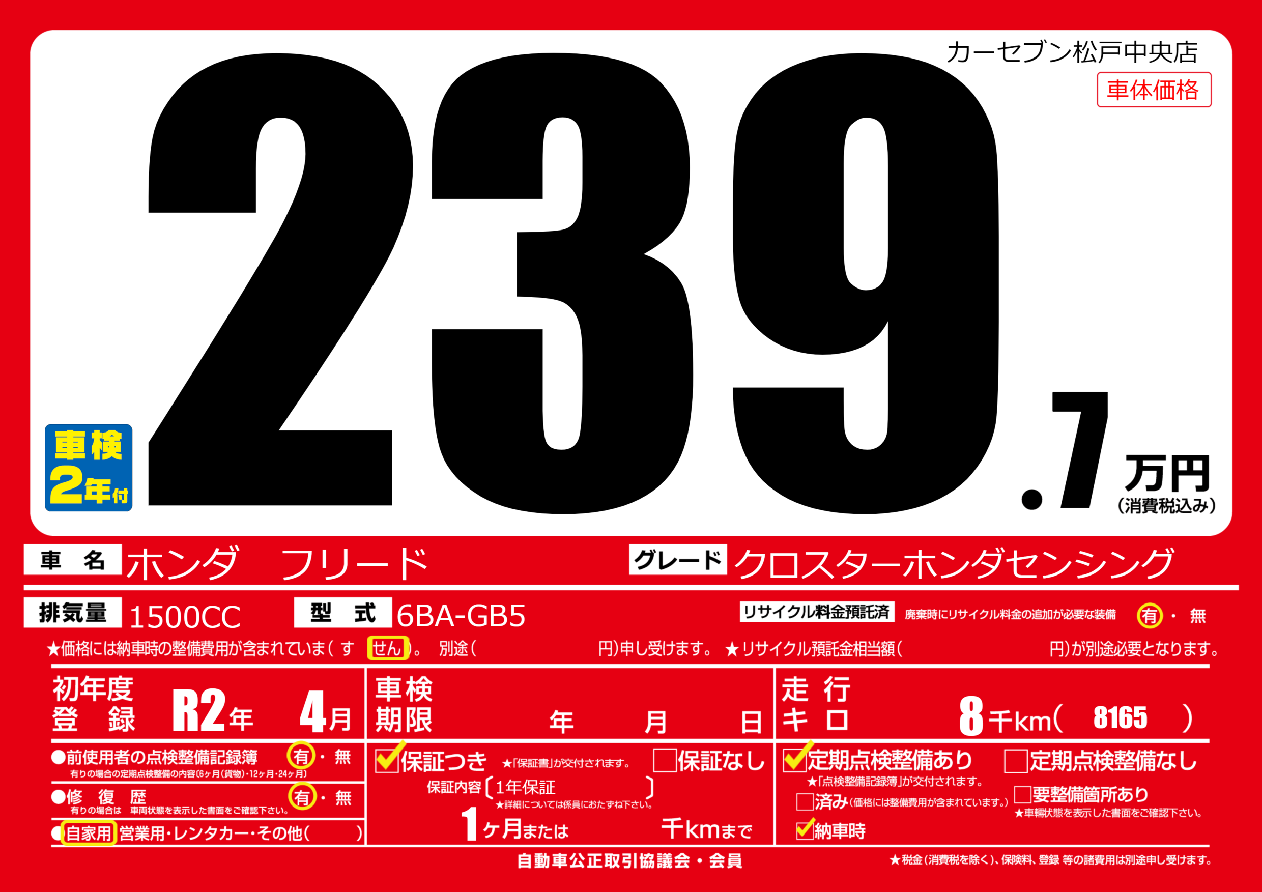 | 車名 | ホンダ フリード | グレード ミッション 排気量 |