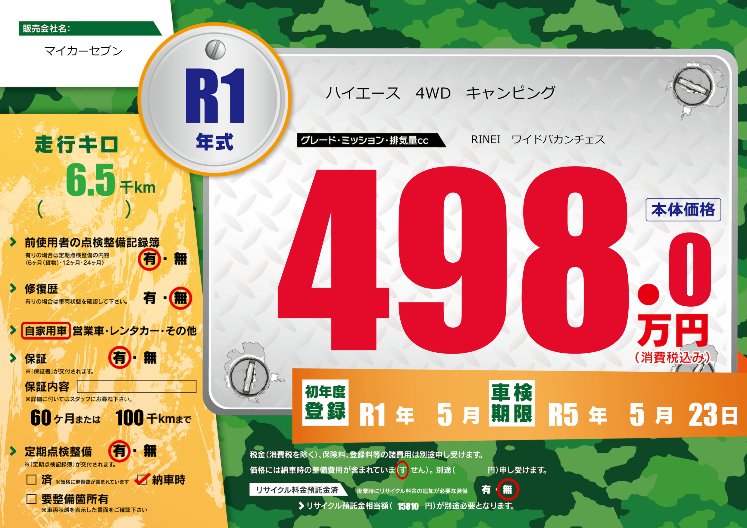 | 車名 | ハイエース 4WD キャンピング | グレード ミッション 排気量 |