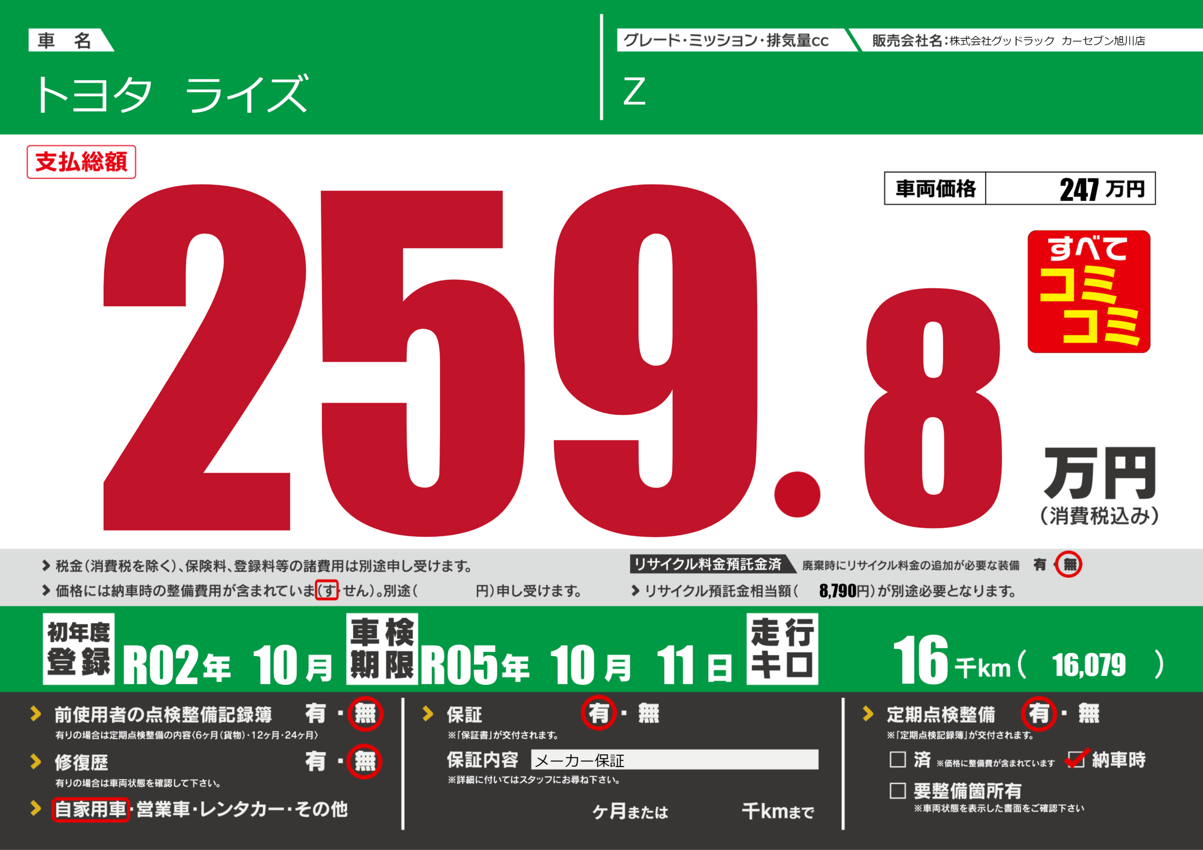 | 車名 | トヨタ ライズ | グレード ミッション 排気量 |