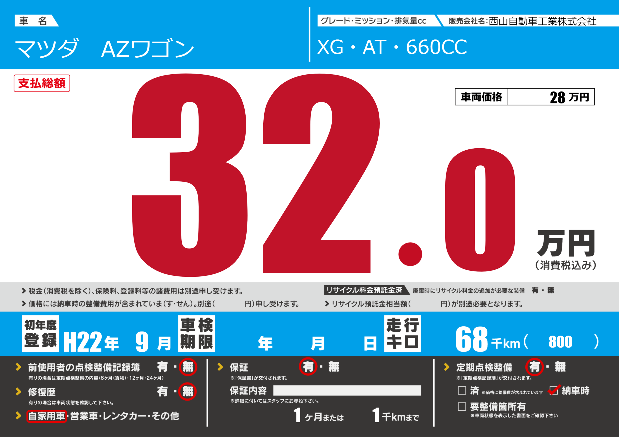 | 定期点検整備 | 定期点検整備あり 納車時あり | ||