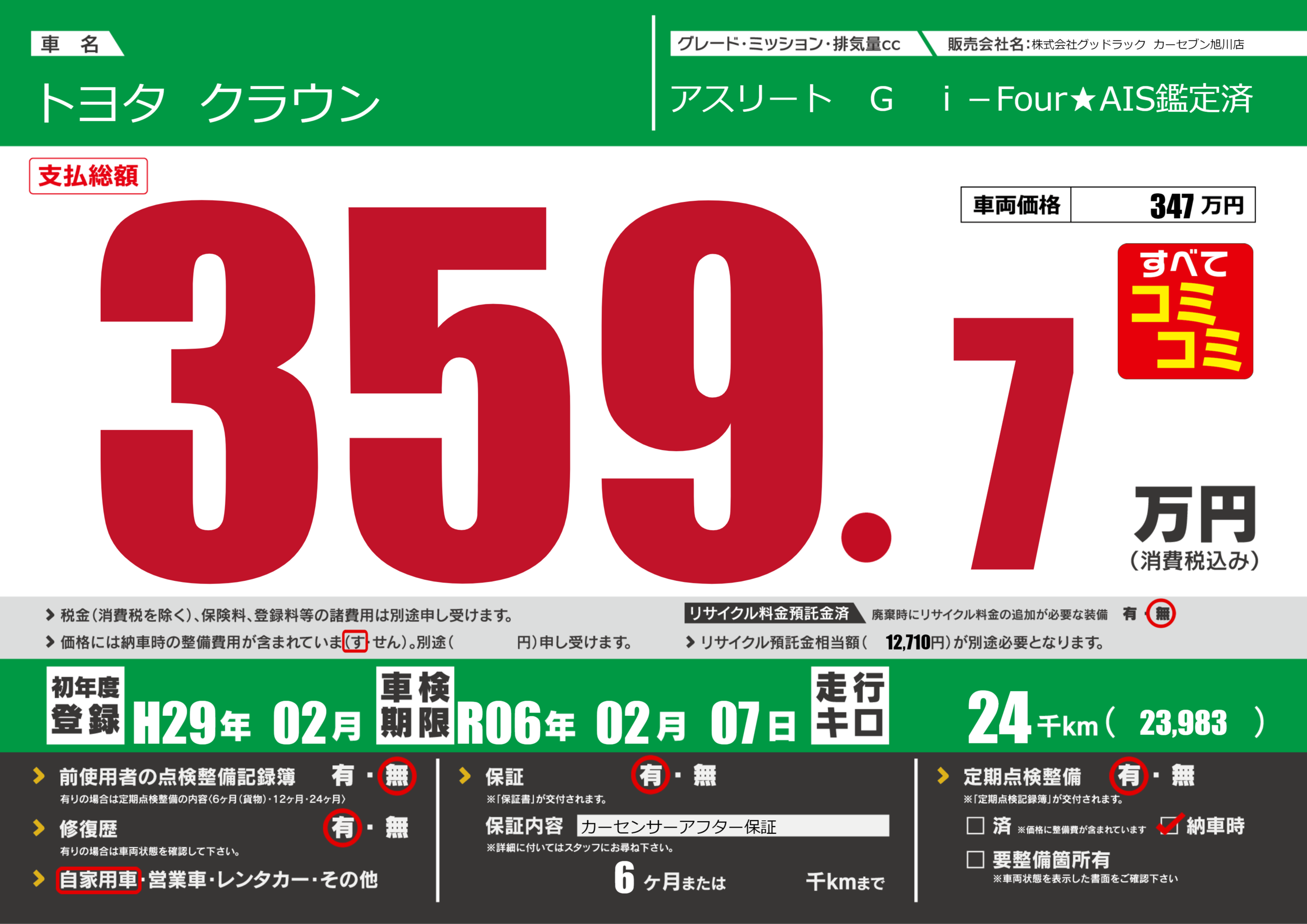 | 車名 | トヨタ クラウン | グレード ミッション 排気量 |