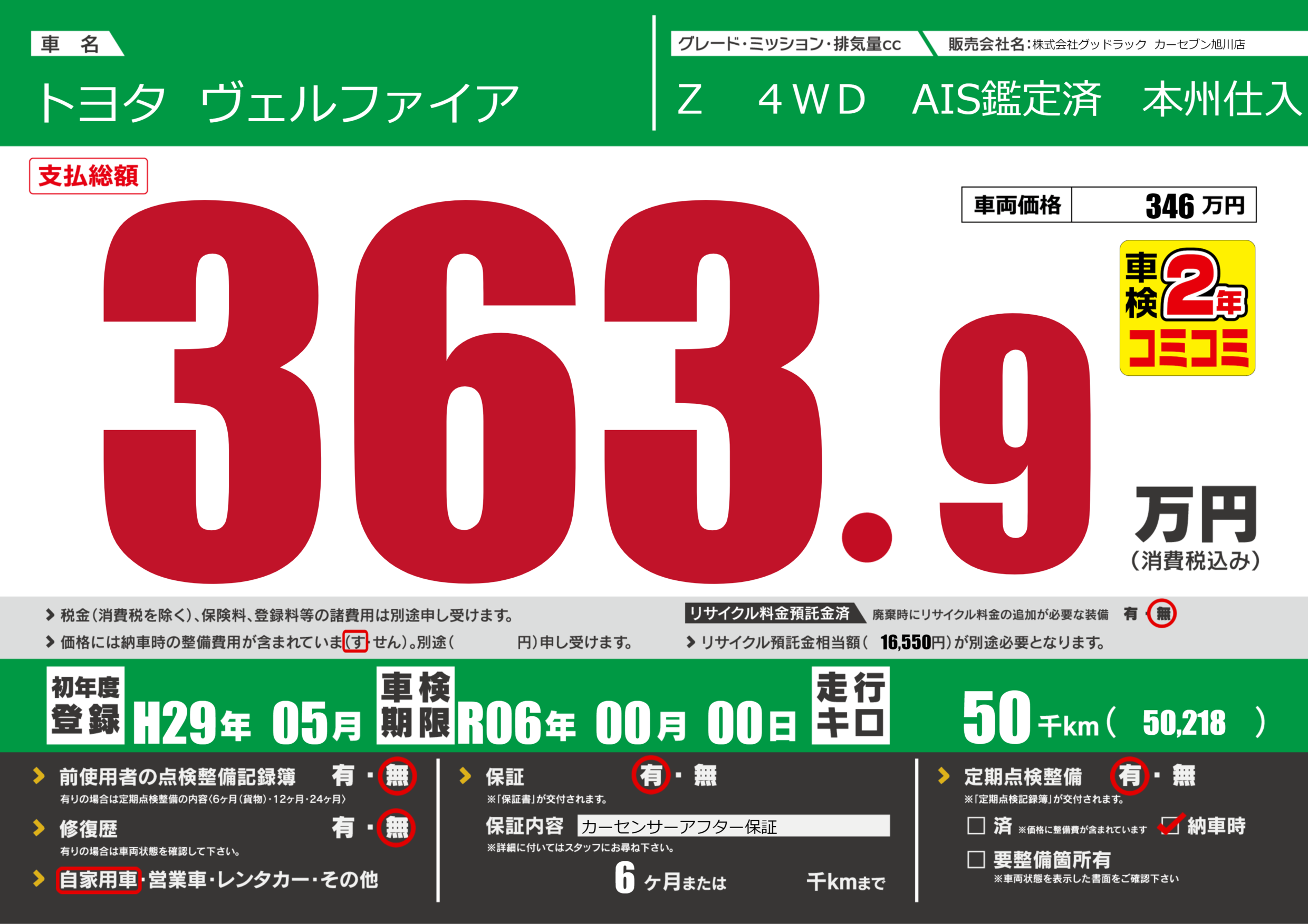 | 車名 | トヨタ ヴェルファイア | グレード ミッション 排気量 |