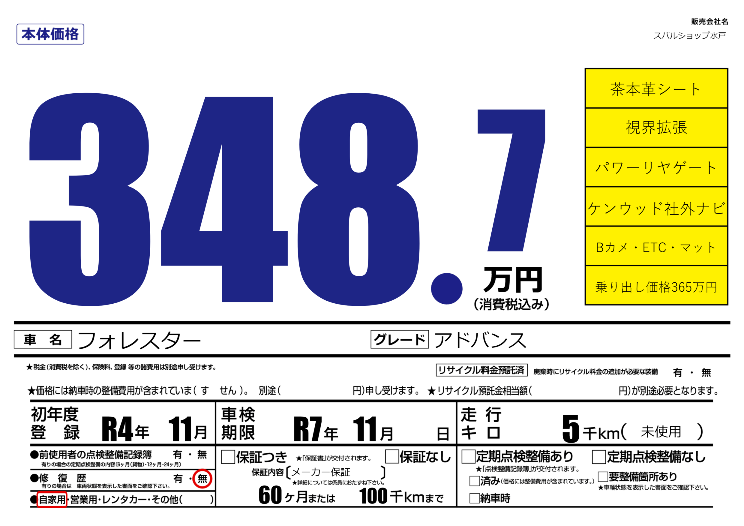 | 車名 | フォレスター | グレード ミッション 排気量 |
