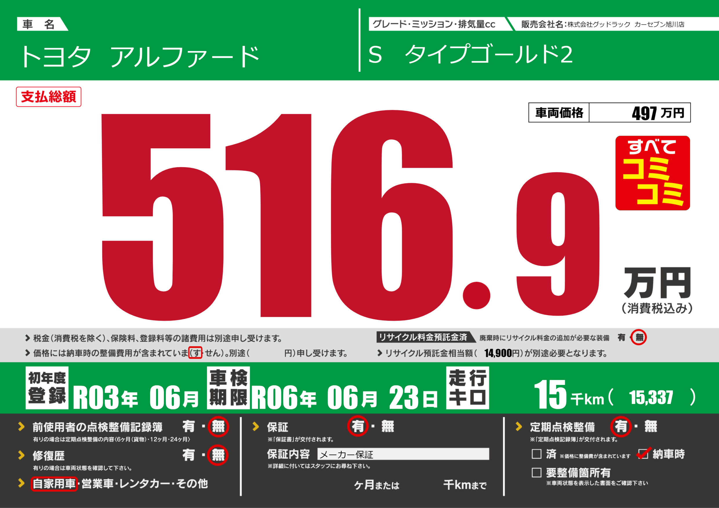 保証付き 保証内容(メーカー保証) ---ヶ月または()千kmまで |