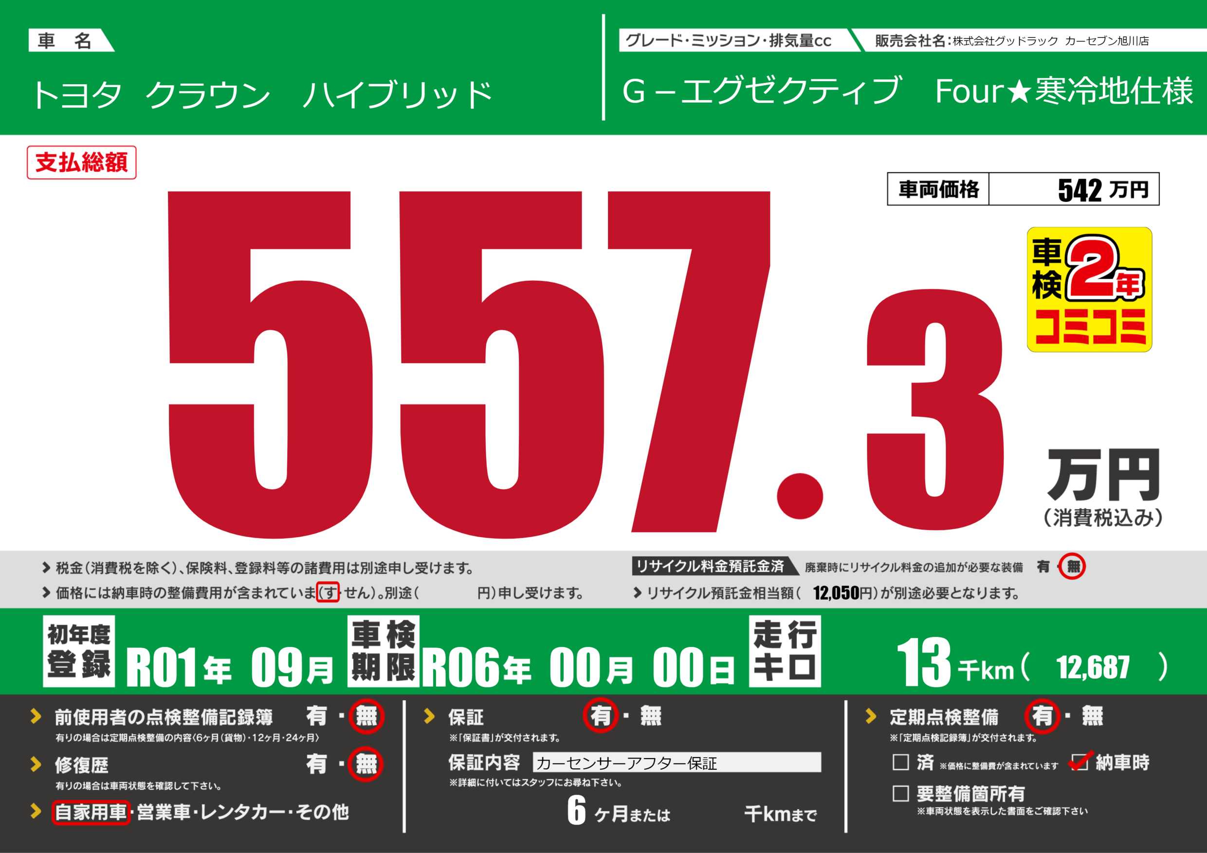 | 走行キロ | 1.3万km | 初年度登録 | R01年09月 |