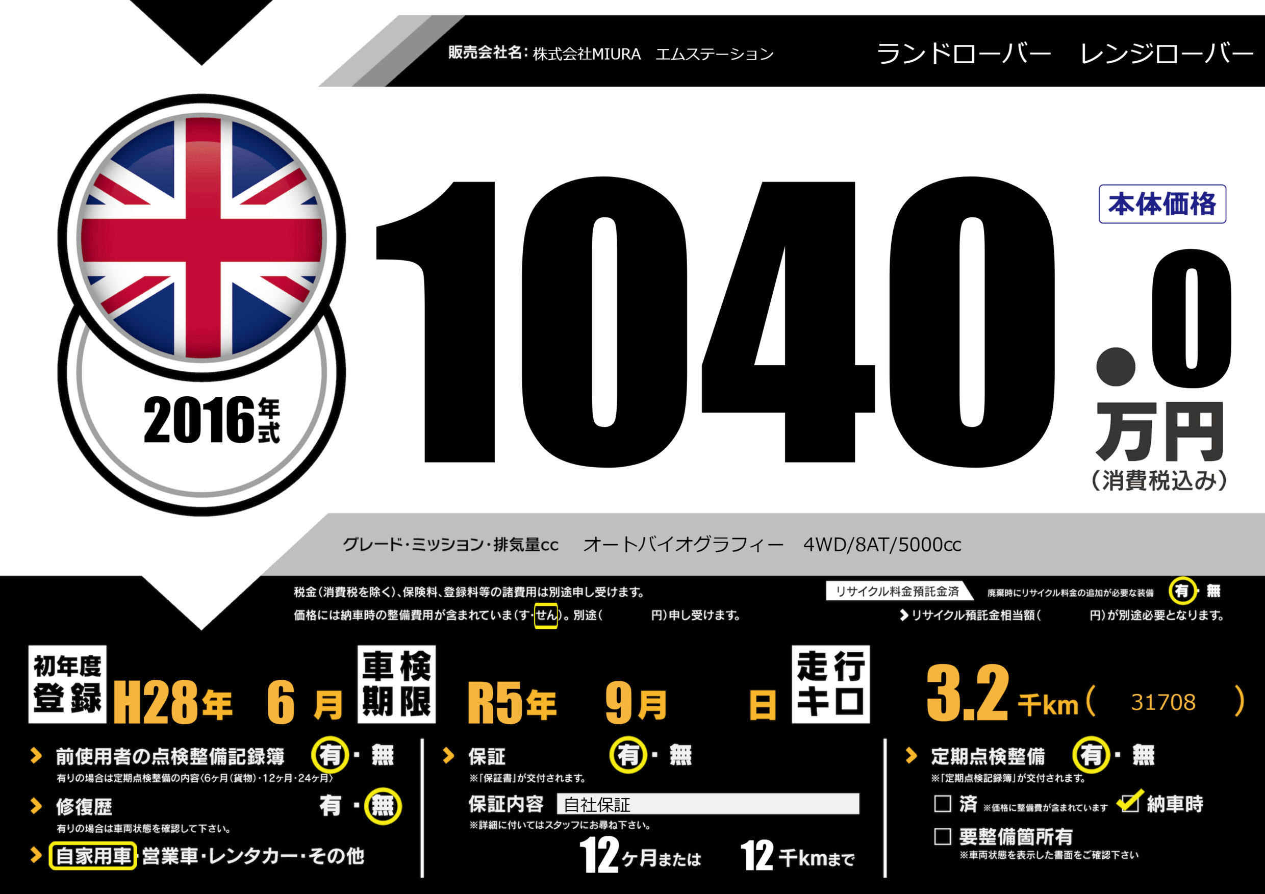 保証付き 保証内容(自社保証) 12ヶ月または(12)千kmまで |