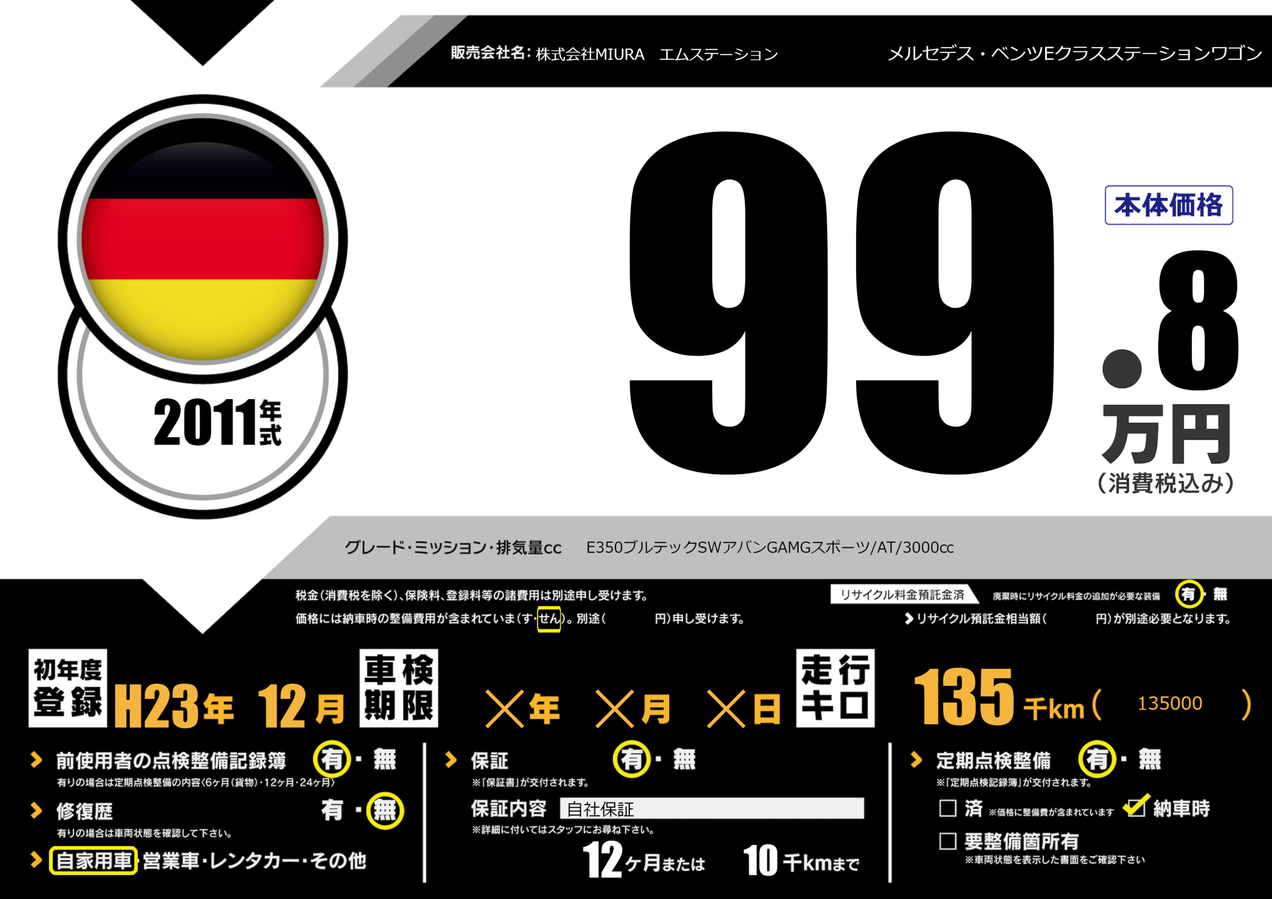 | 車名 | メルセデス・ベンツEクラスステーションワゴン | グレード ミッション 排気量 |