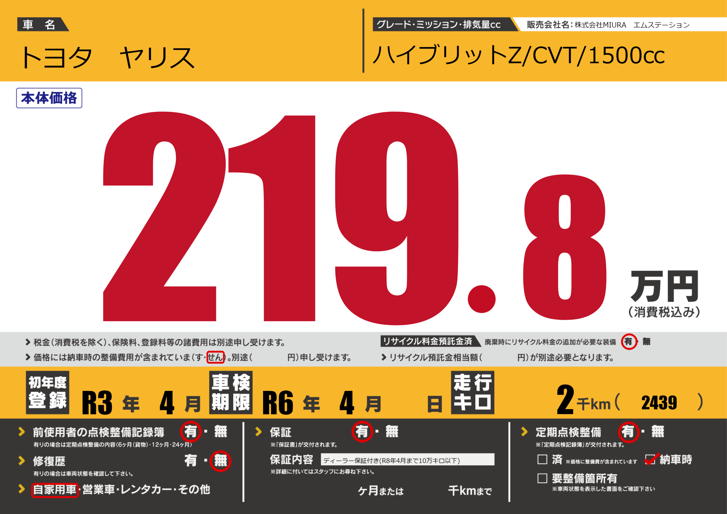 保証付き 保証内容(ディーラー保証付き(R8年4月まで10万キロ以下)) ---ヶ月または()千kmまで |