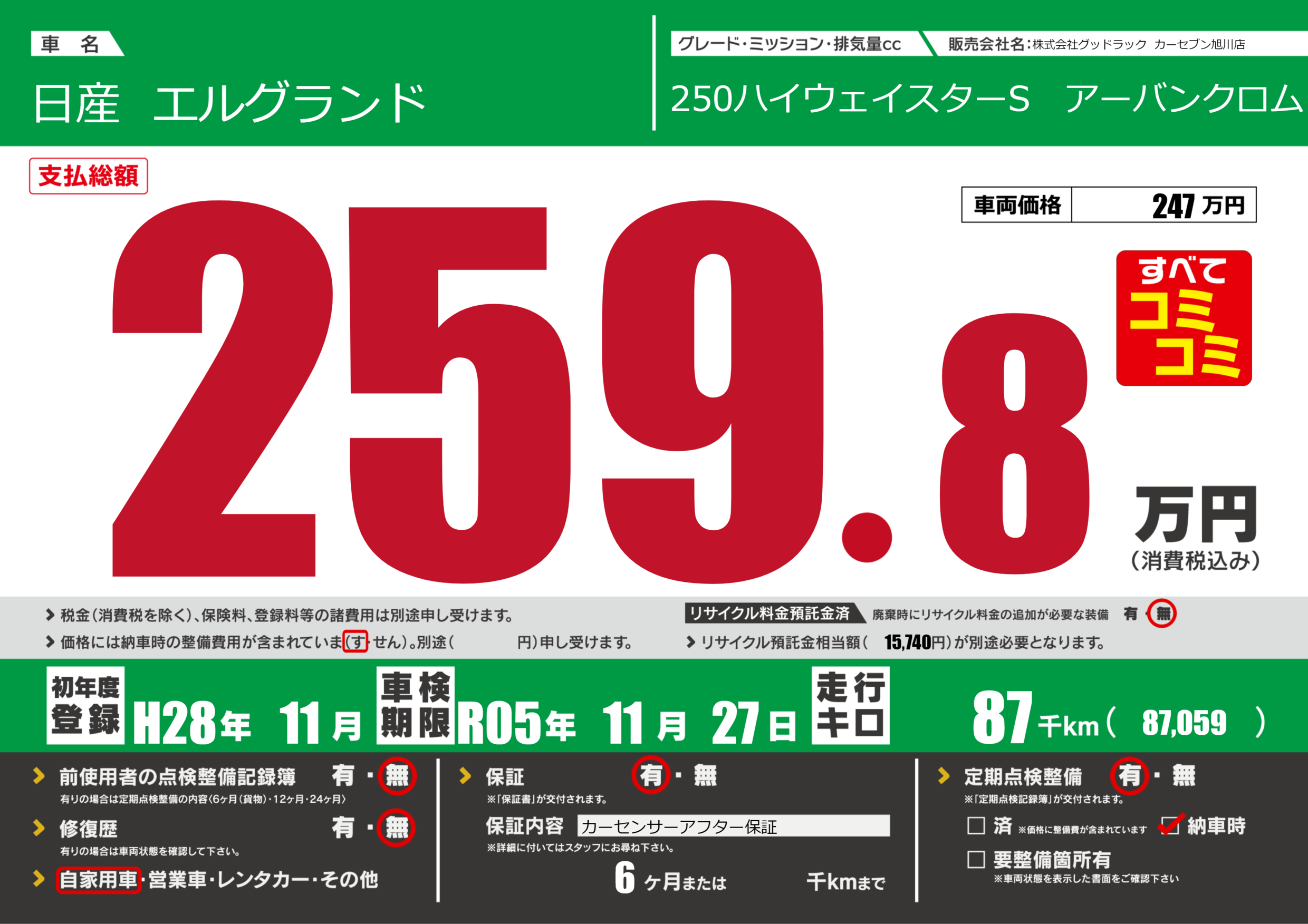 | 走行キロ | 8.7万km | 初年度登録 | H28年11月 |