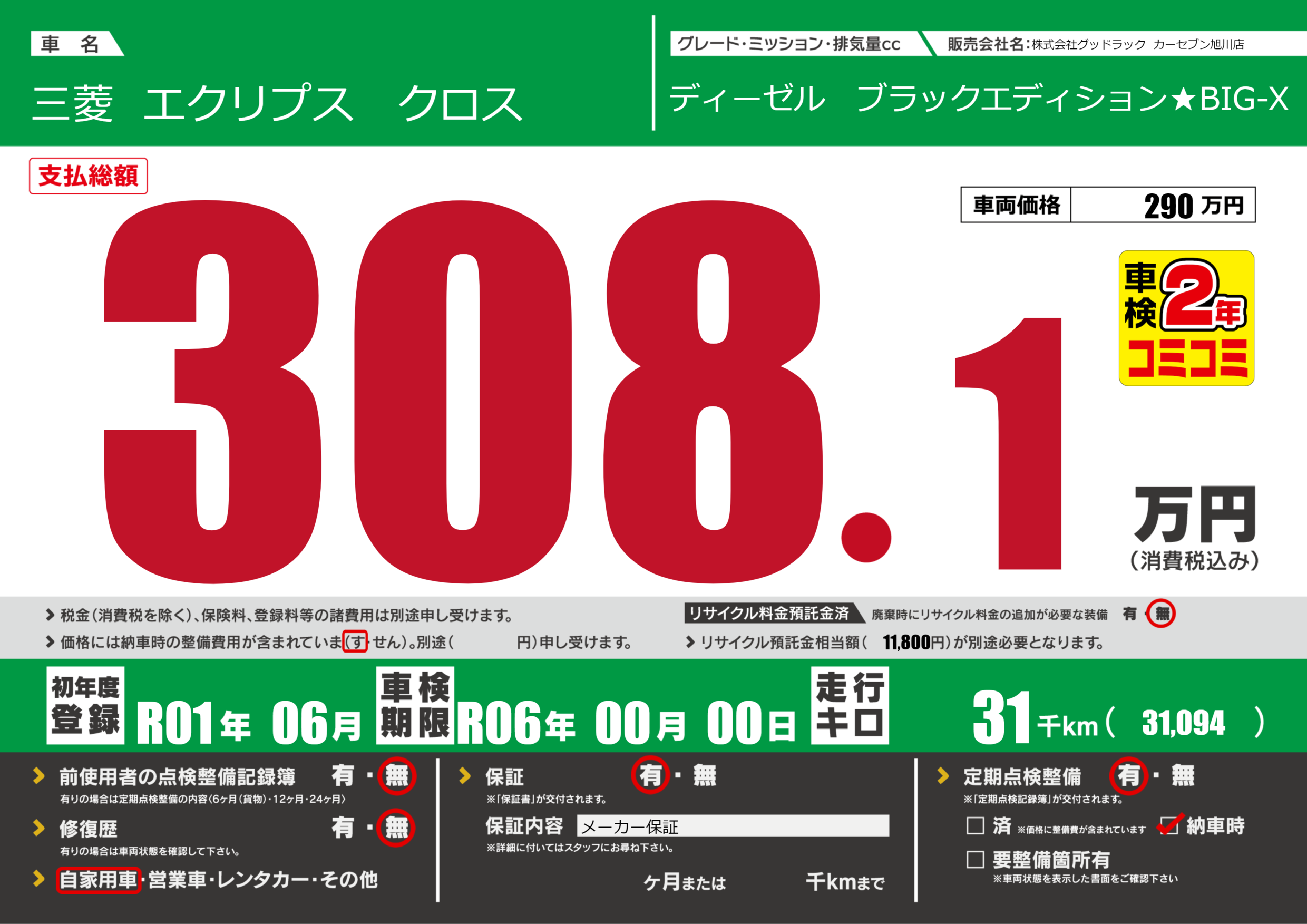 | 車名 | 三菱 エクリプス クロス | グレード ミッション 排気量 |