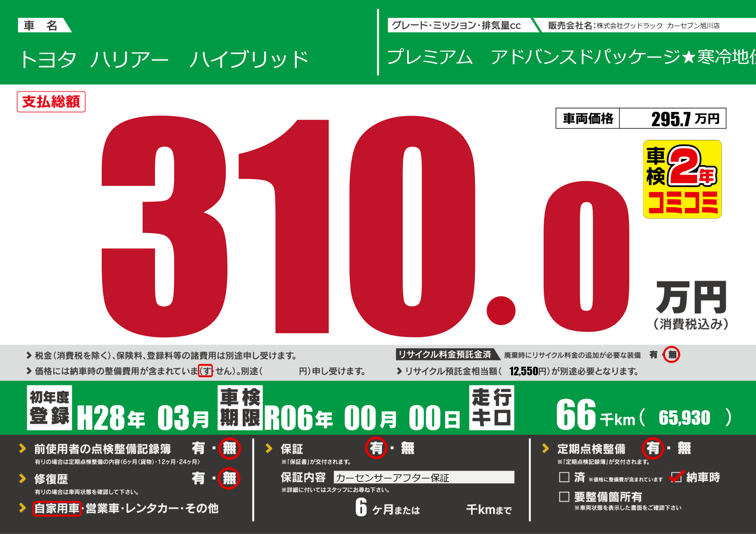 | 走行キロ | 6.6万km | 初年度登録 | H28年03月 |