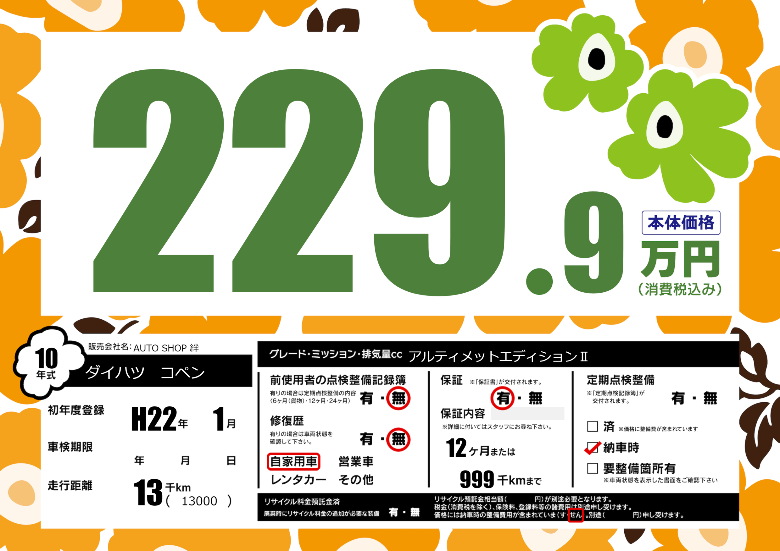 | 車名 | ダイハツ コペン | グレード ミッション 排気量 |