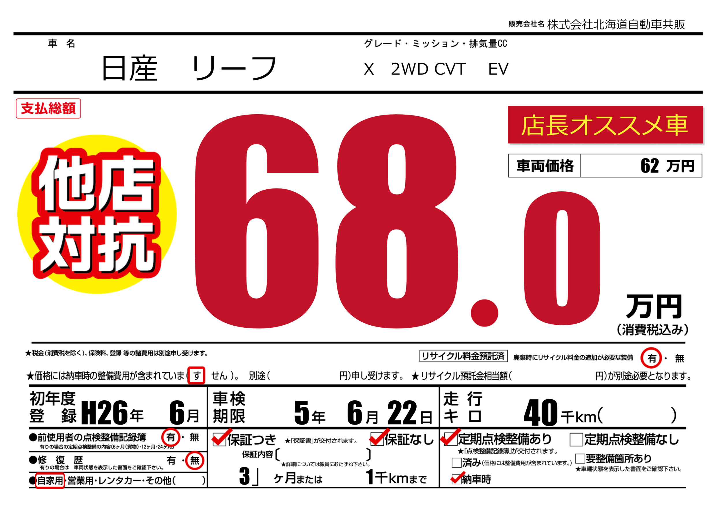 | 車名 | 日産 リーフ | グレード ミッション 排気量 |