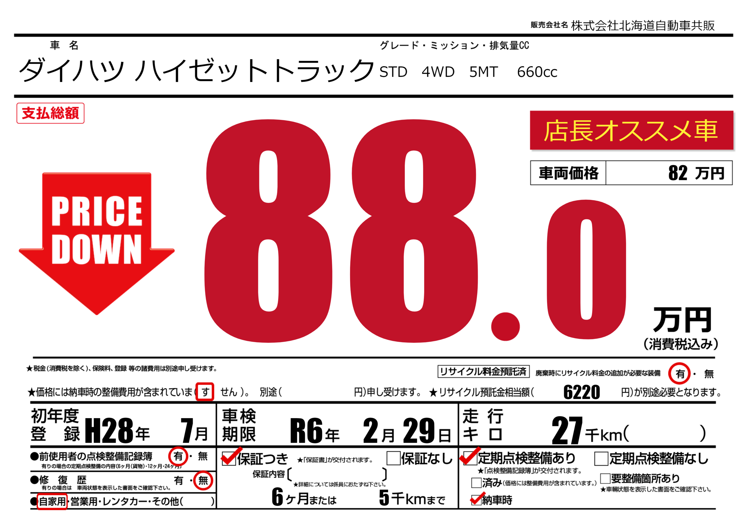 | 車名 | ダイハツ ハイゼットトラック | グレード ミッション 排気量 |