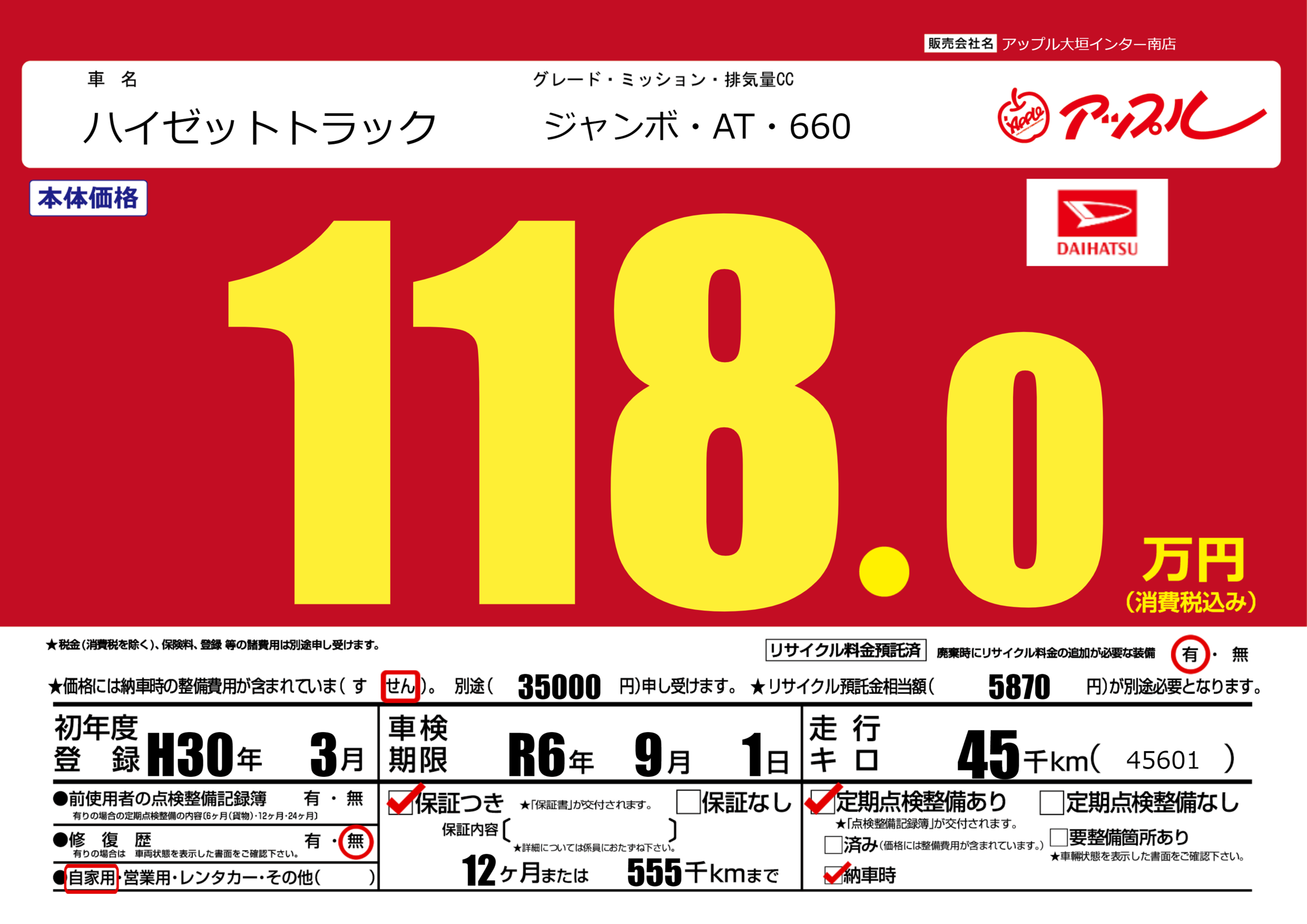 | 車検制限 | R6年 9月 1日 | ||