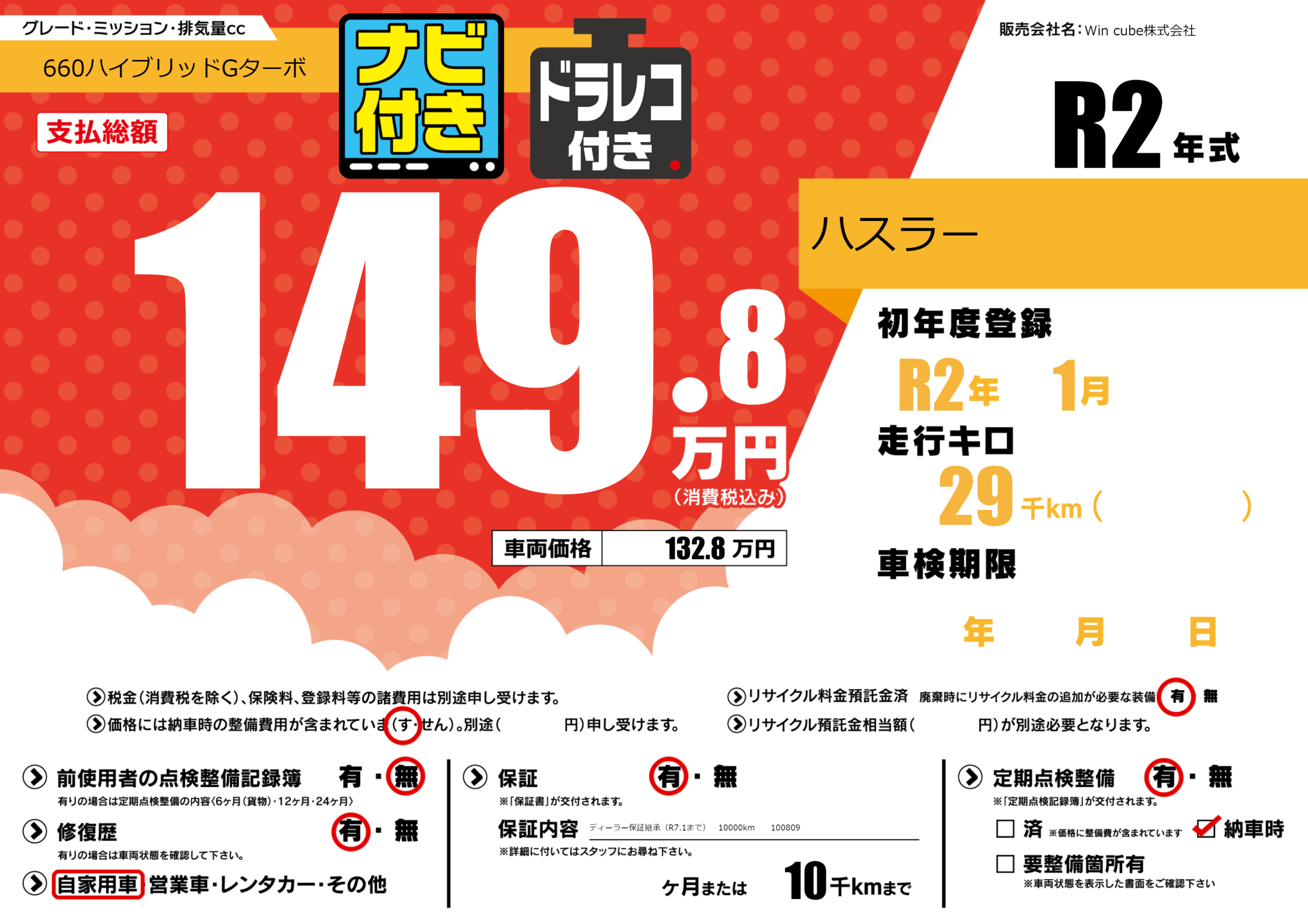 保証付き 保証内容(ディーラー保証継承(R7.1まで) 10000km 100809) ---ヶ月または(10)千kmまで |