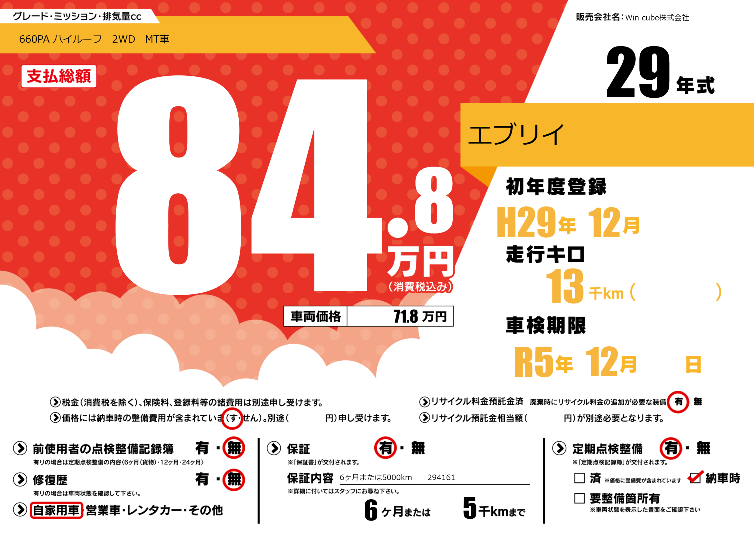 | 定期点検整備 | 定期点検整備あり 納車時あり | ||