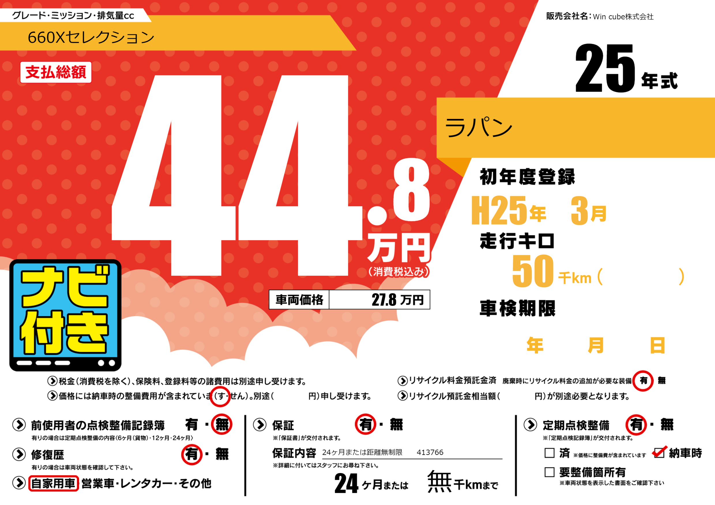 | 定期点検整備 | 定期点検整備あり 納車時あり | ||