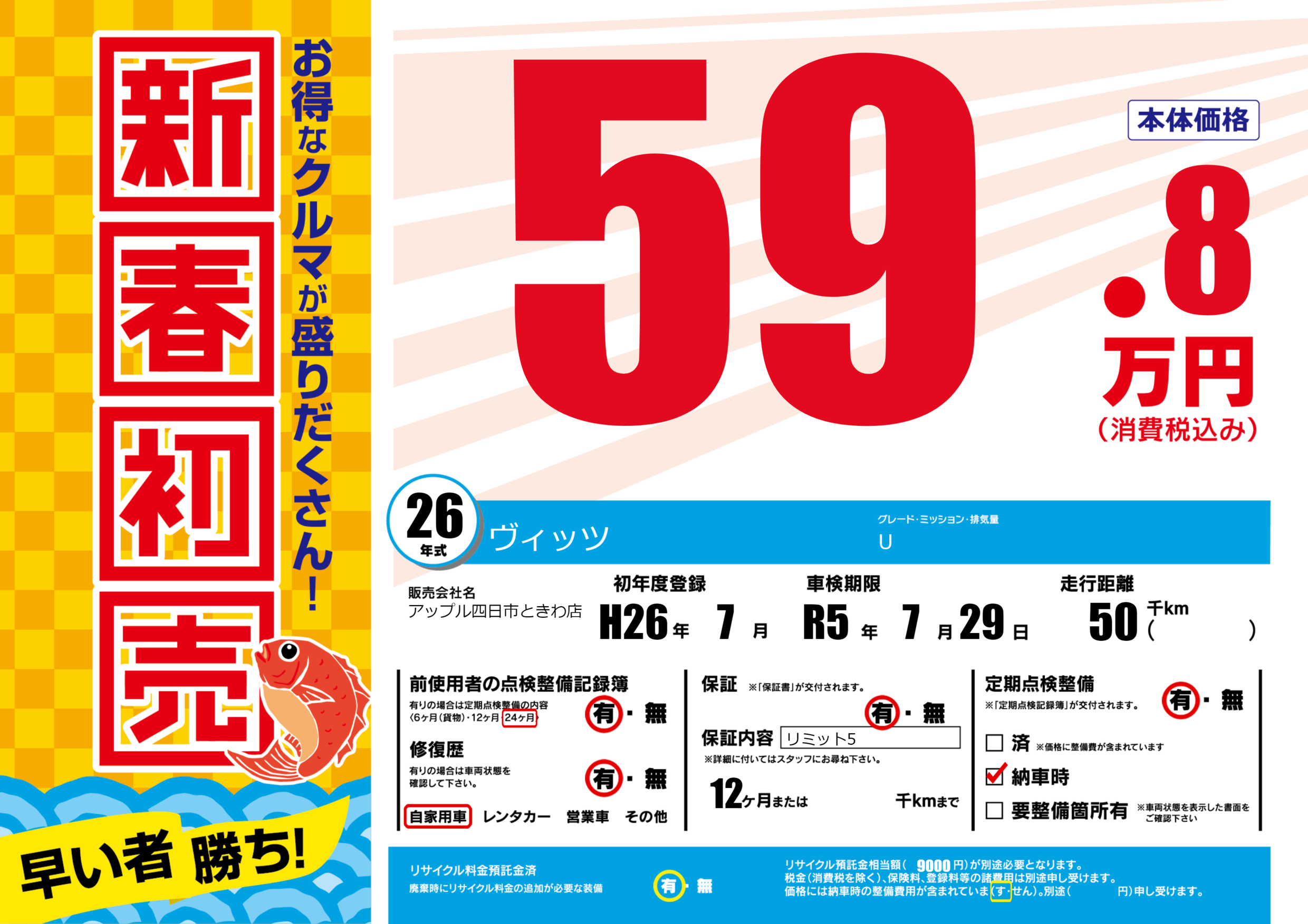 | 走行キロ | 5万km | 初年度登録 | H26年7月 |
