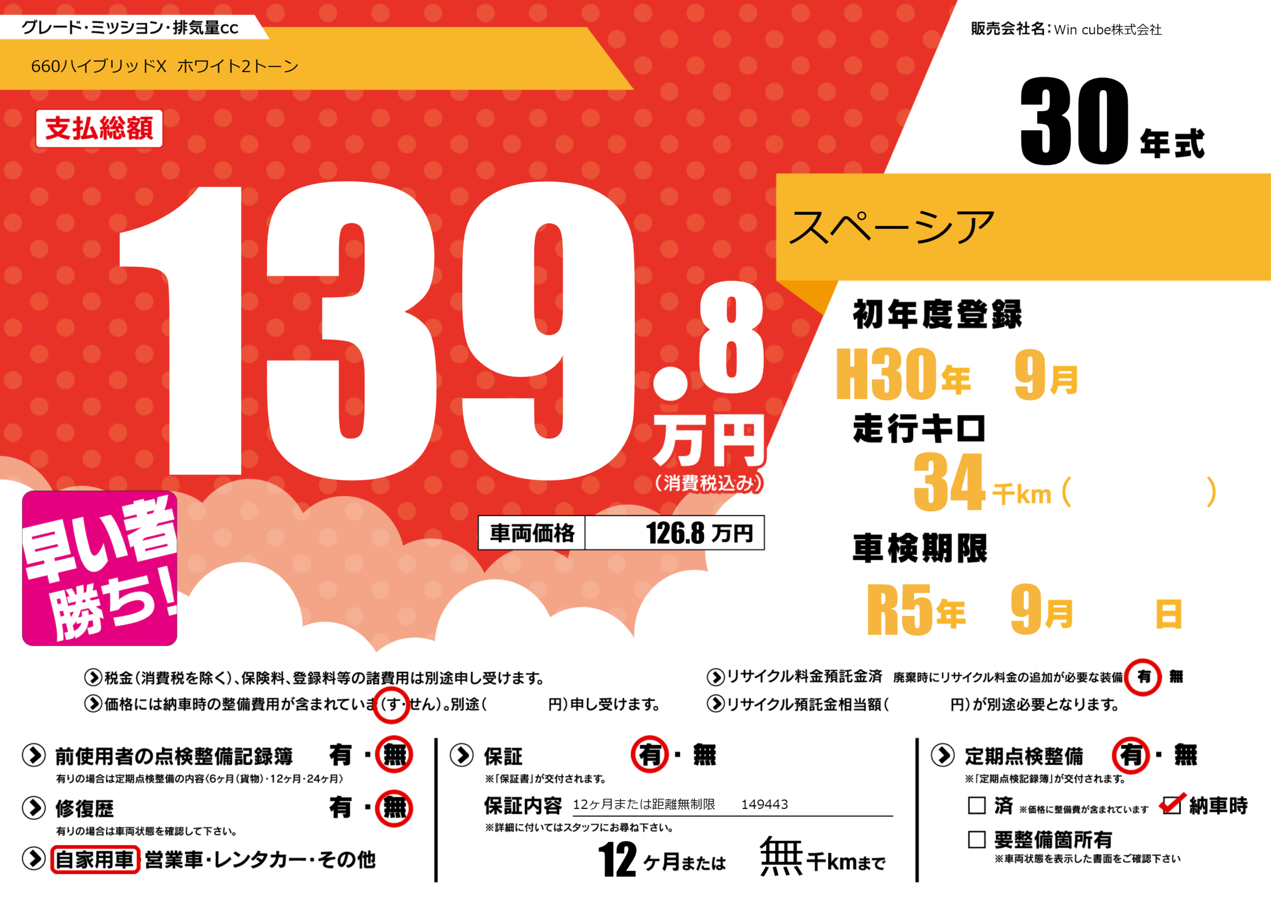 | 定期点検整備 | 定期点検整備あり 納車時あり | ||