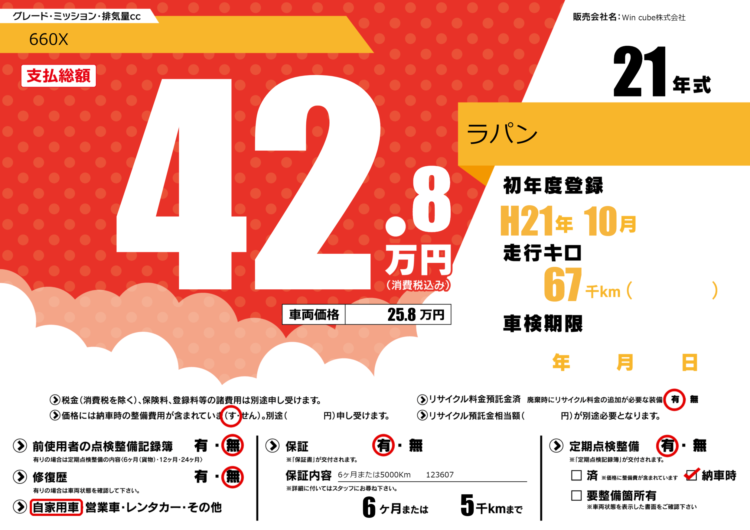 | 車名 | ラパン | グレード ミッション 排気量 |