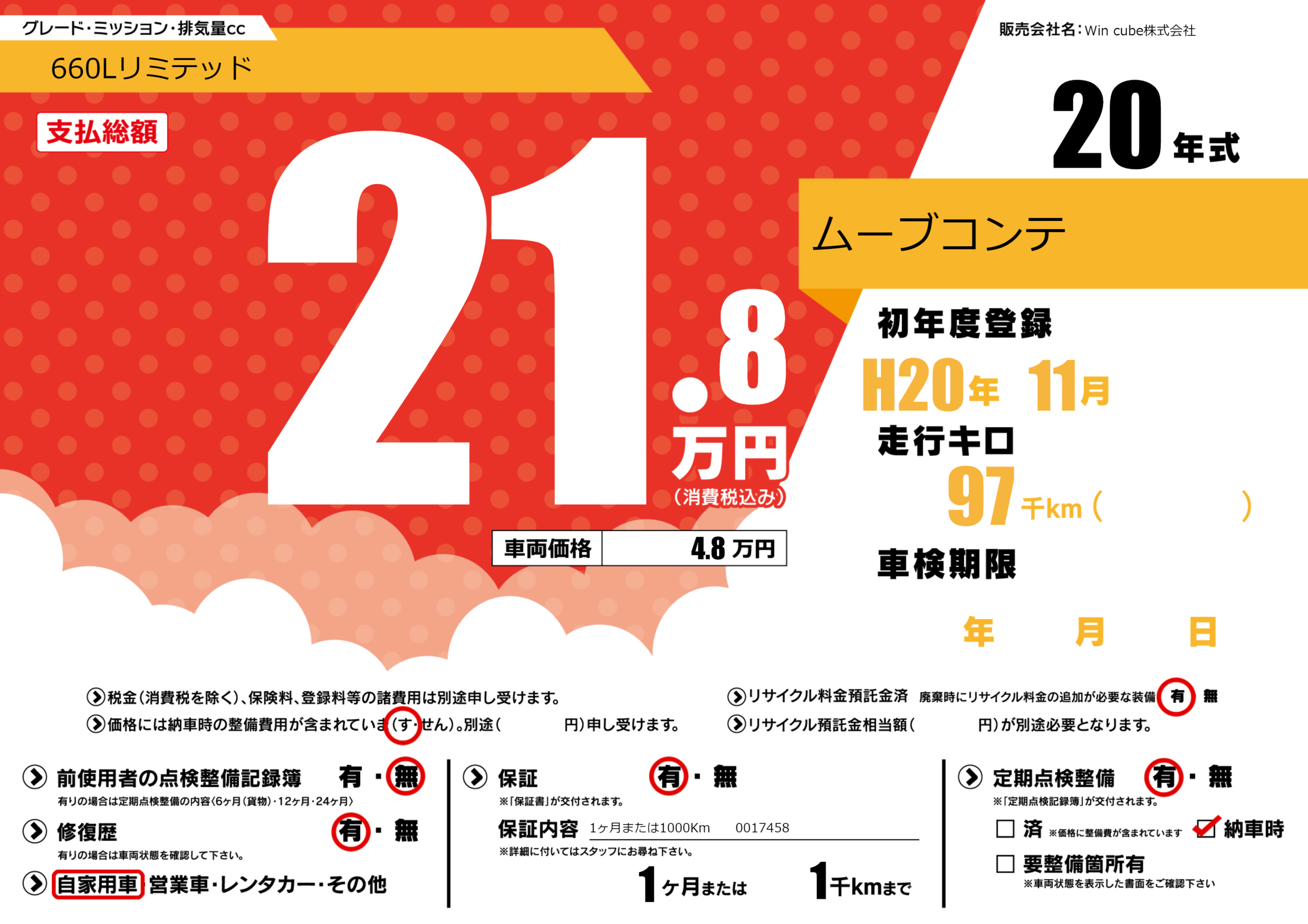 | 定期点検整備 | 定期点検整備あり 納車時あり | ||
