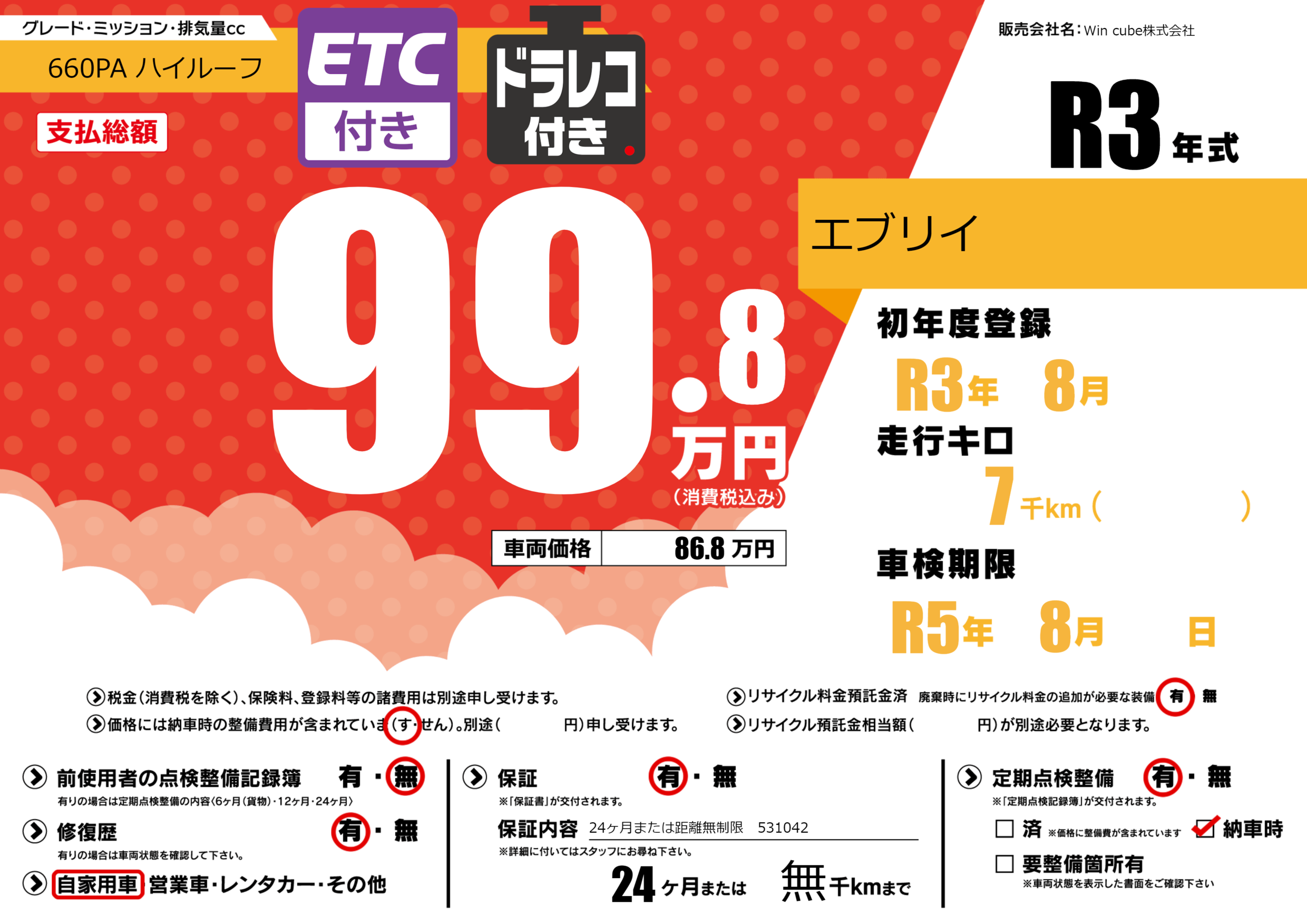 | 定期点検整備 | 定期点検整備あり 納車時あり | ||