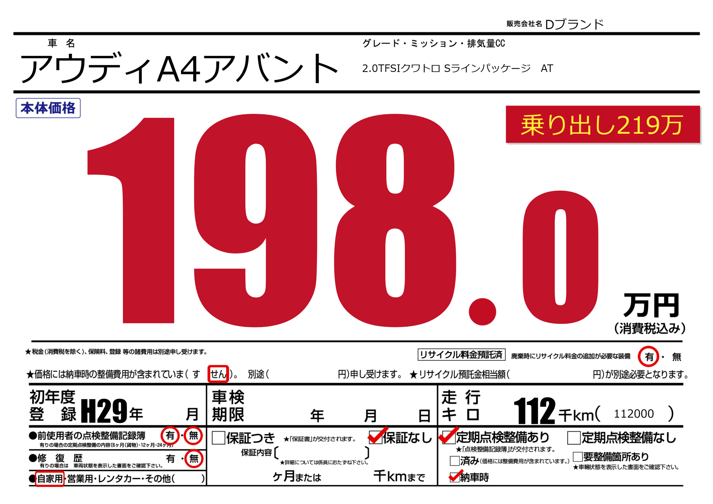 | 車名 | アウディA4アバント | グレード ミッション 排気量 |