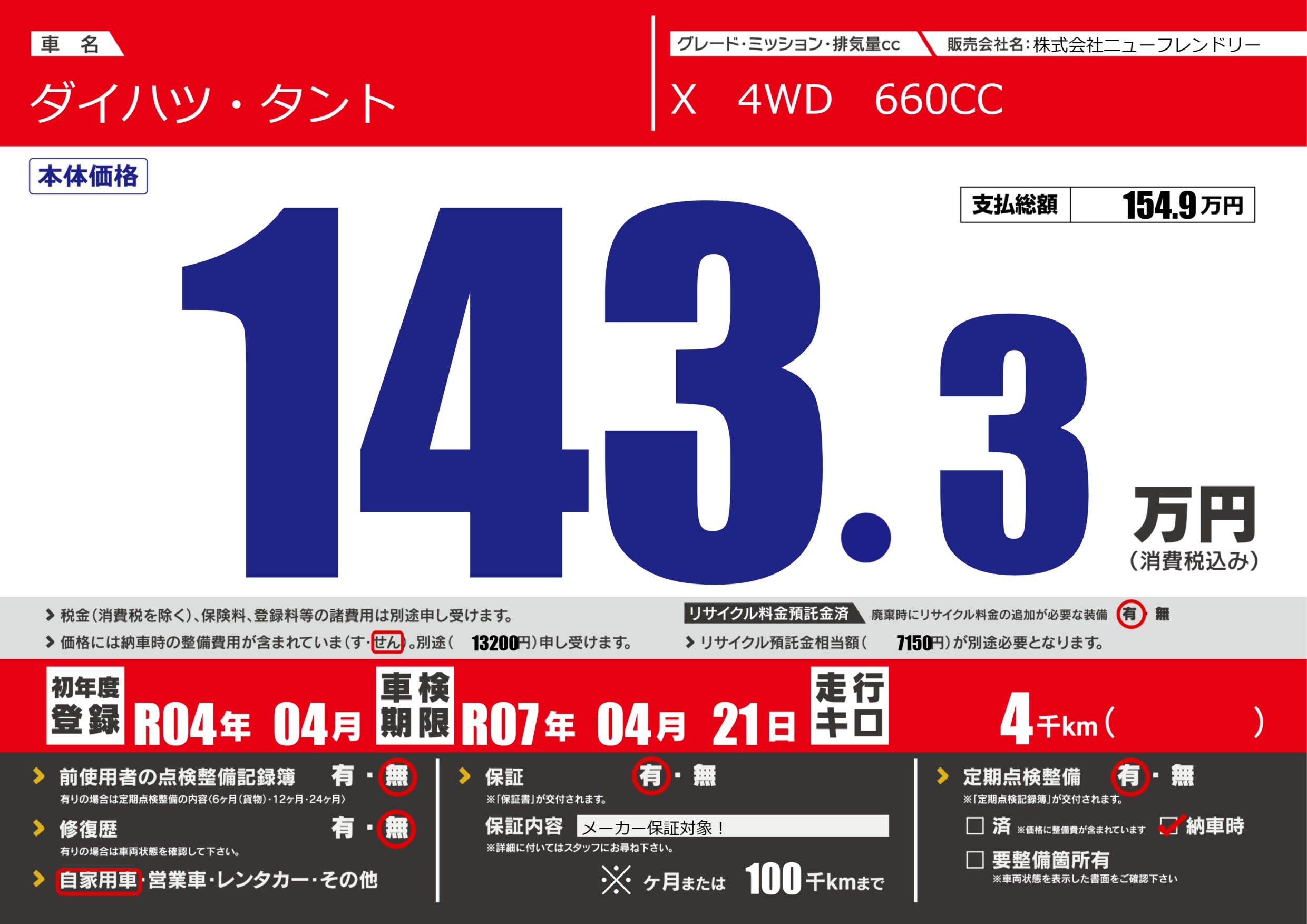 | 定期点検整備 | 定期点検整備あり 納車時あり | ||