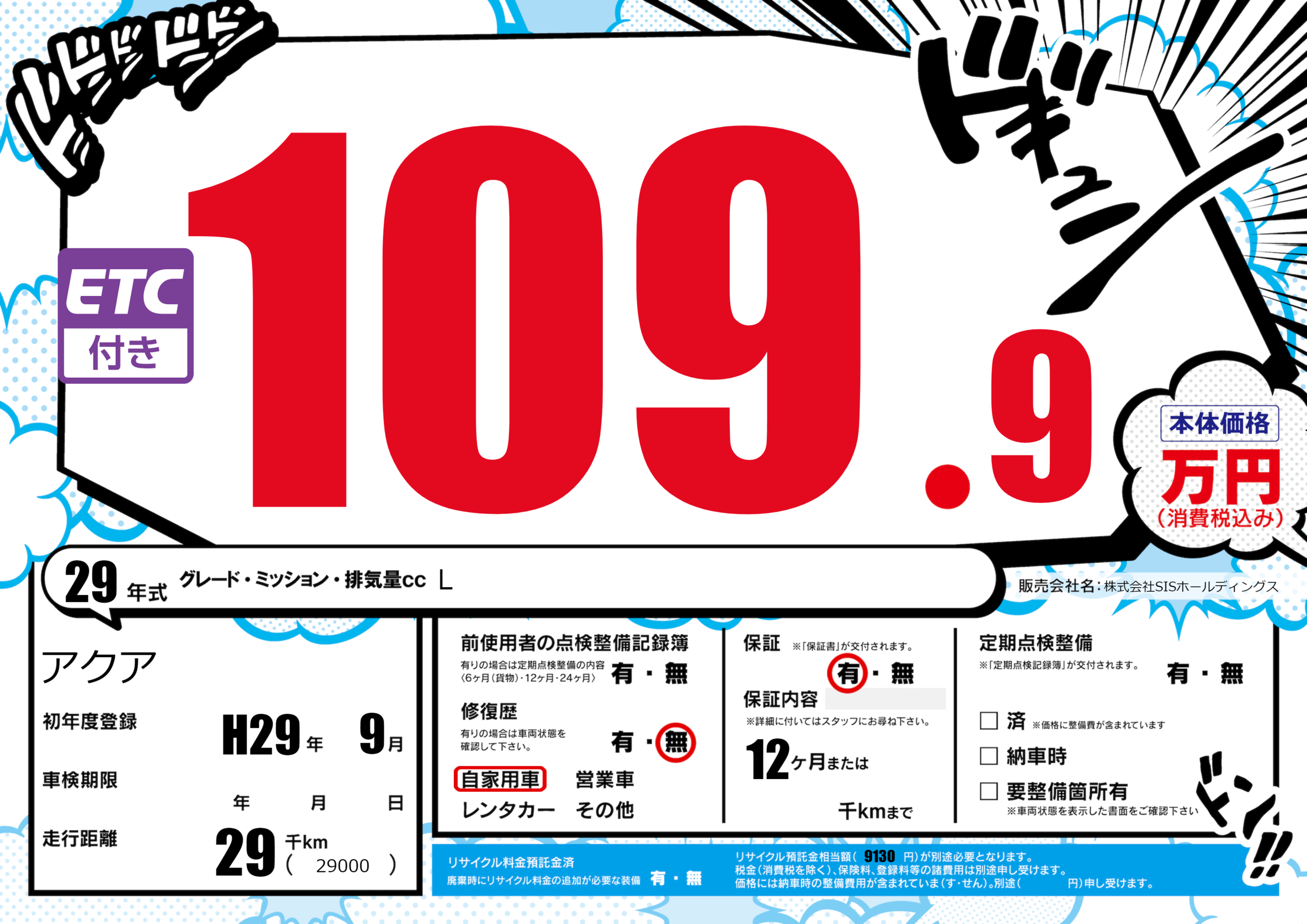 | 走行キロ | 2.9万km | 初年度登録 | H29年9月 |
