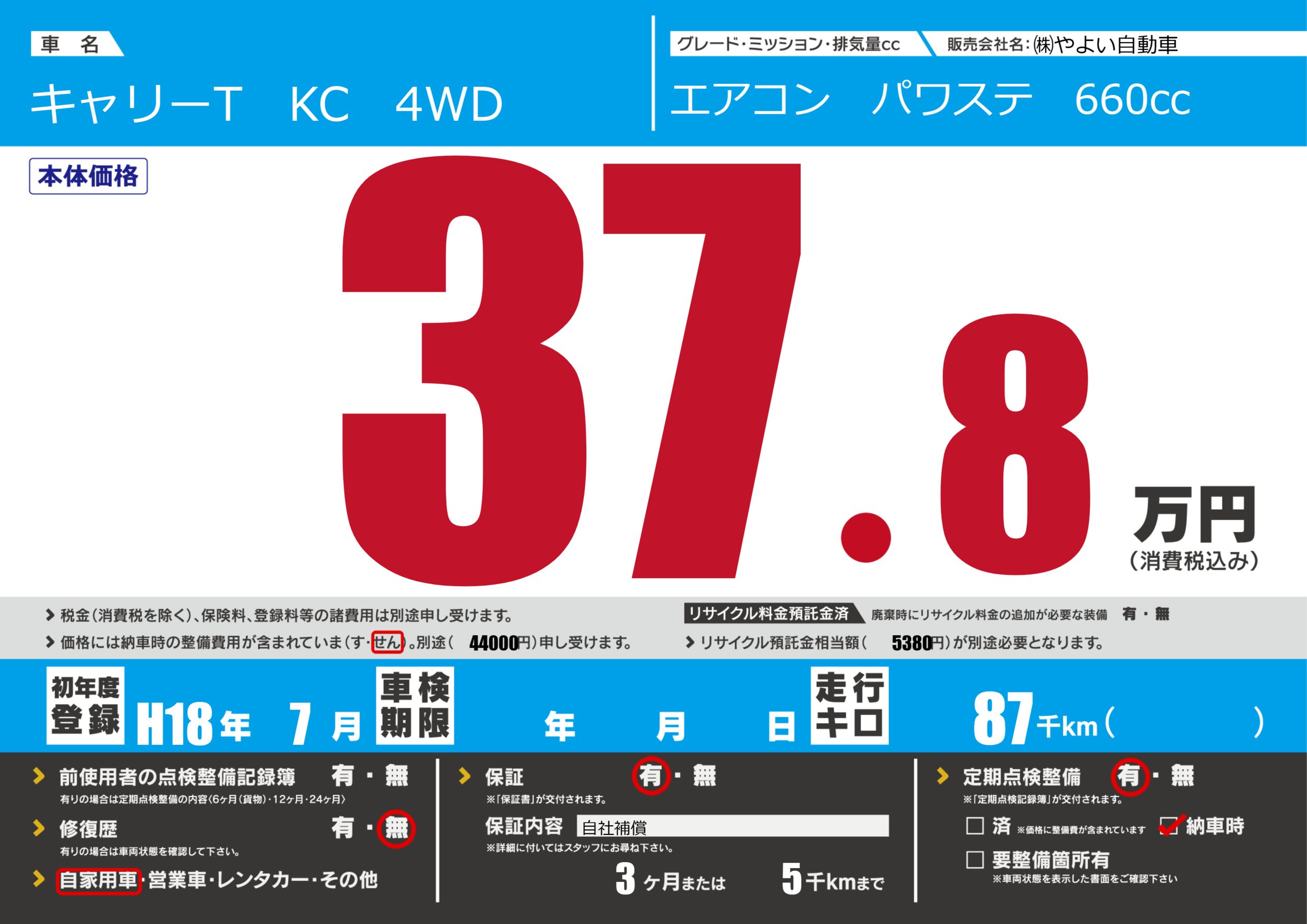 保証付き 保証内容(自社補償) 3ヶ月または(5)千kmまで |