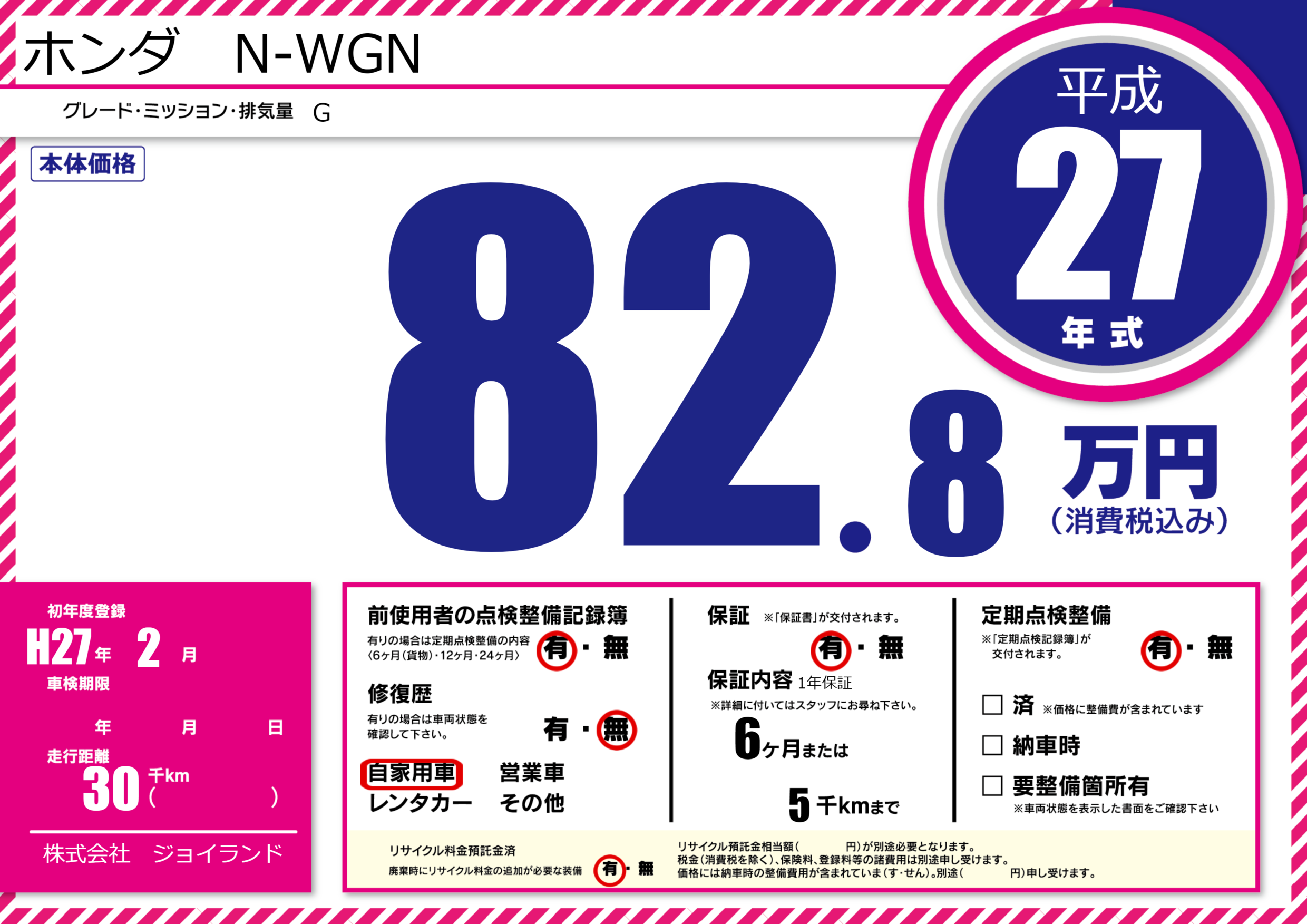 | 走行キロ | 3万km | 初年度登録 | H27年2月 |